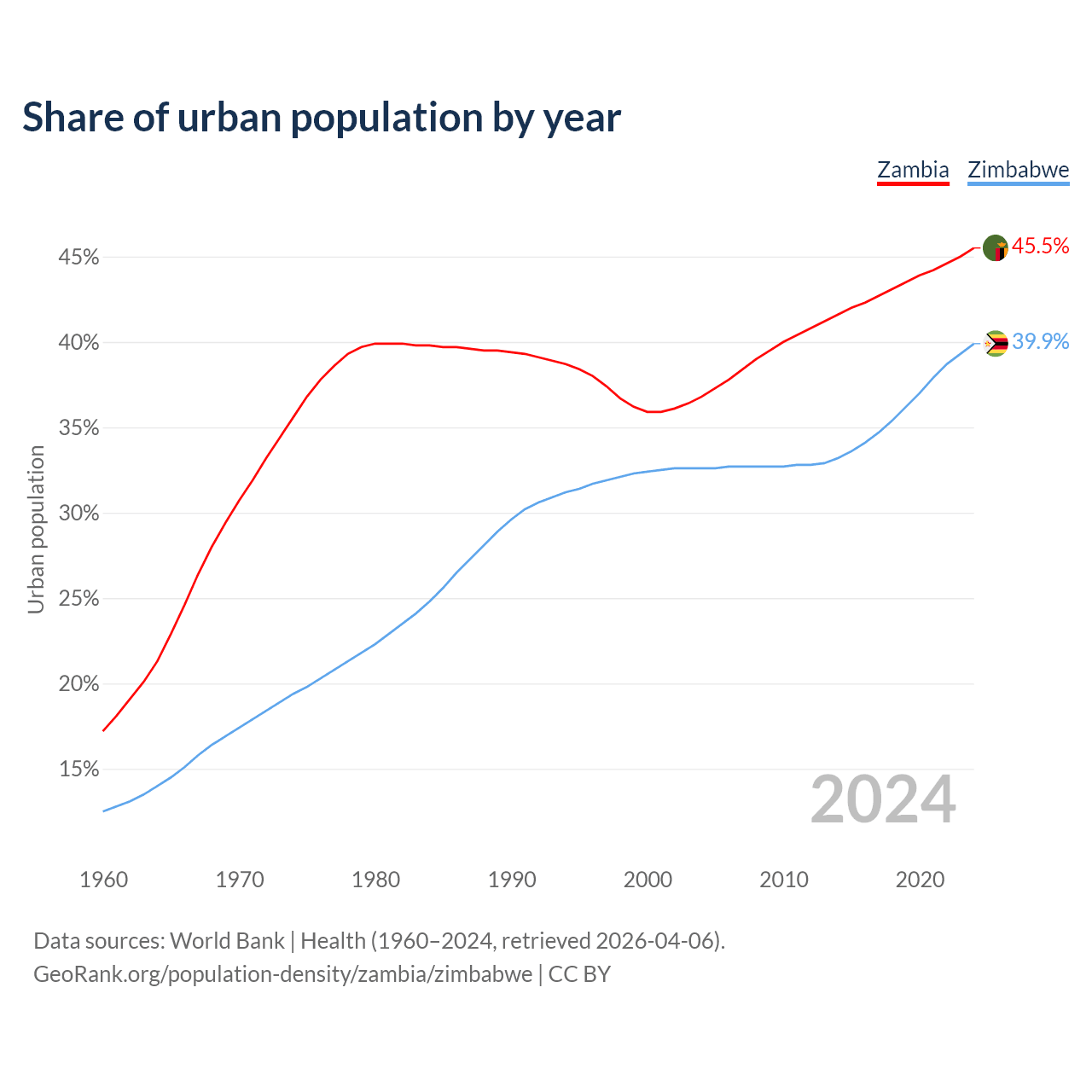 From 2004 to 2024, the share of urban population changed from 36.8% to 45.5% in Zambia and from 32.6% to 39.9% in Zimbabwe.