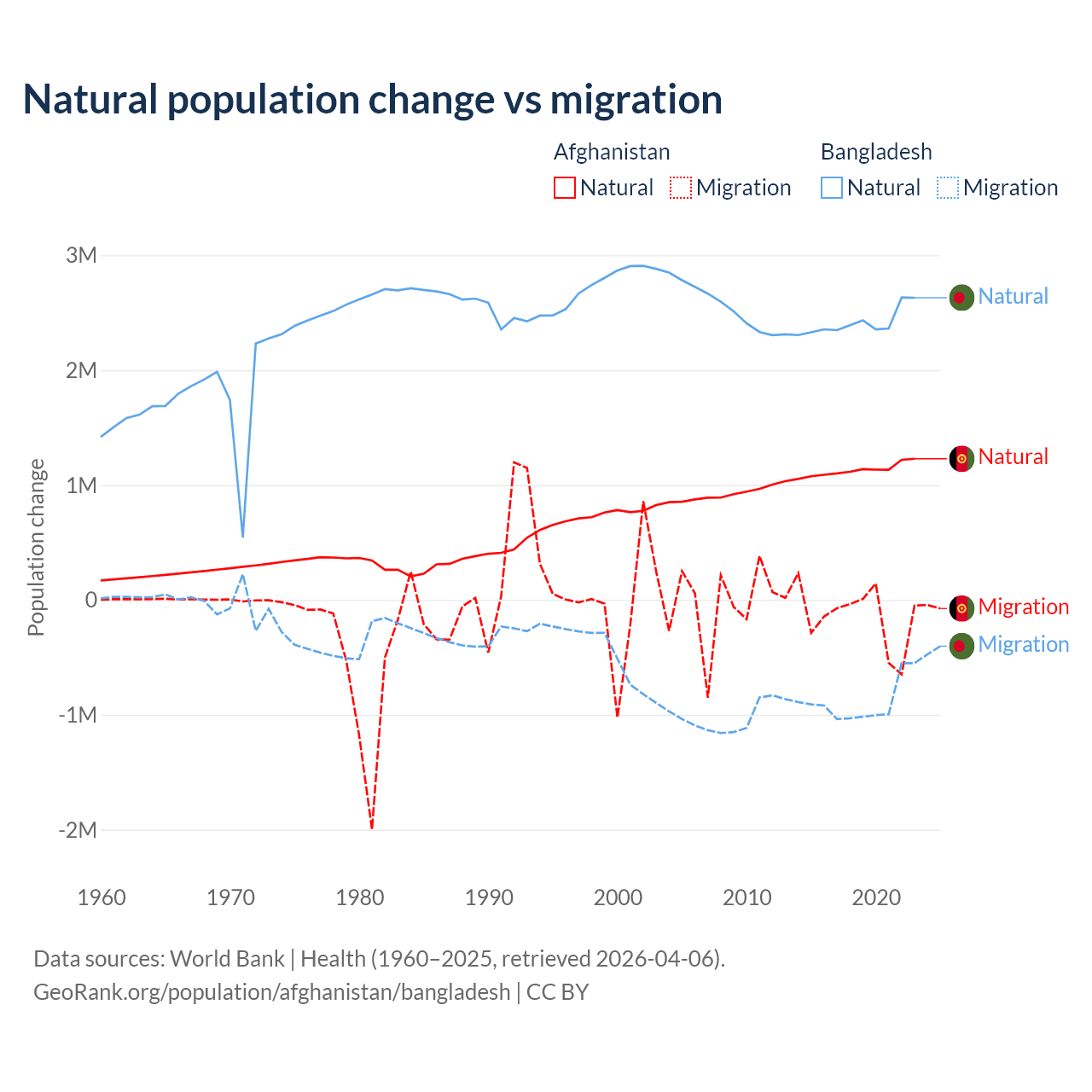 Over the last 10 years, 89% of the population change in Afghanistan is from natural causes (a gain of 11,292,049 people) and 11% is from migration (a loss of 1,396,045 people). In Bangladesh 73.1% is from natural causes (a gain of 24,148,039 people) and 26.9% is from migration (a loss of 8,897,408 people).