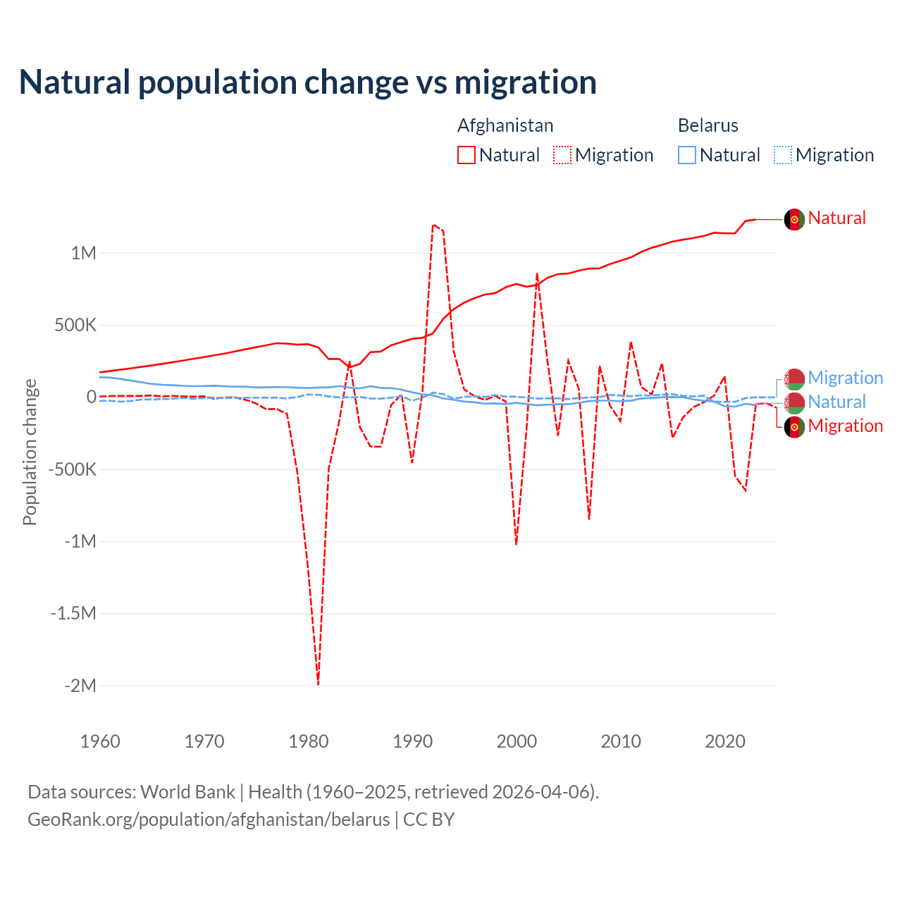 Over the last 10 years, 89% of the population change in Afghanistan is from natural causes (a gain of 11,292,049 people) and 11% is from migration (a loss of 1,396,045 people). In Belarus 84.2% is from natural causes (a loss of 318,682 people) and 15.8% is from migration (a loss of 59,605 people).