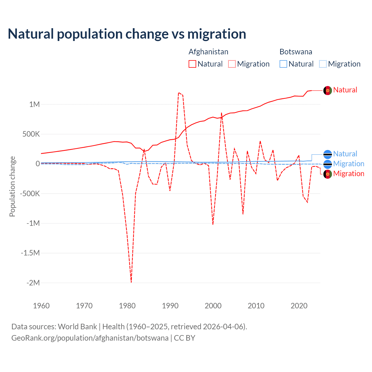 Over the last 10 years, 89% of the population change in Afghanistan is from natural causes (a gain of 11,292,049 people) and 11% is from migration (a loss of 1,396,045 people). In Botswana 82.5% is from natural causes (a gain of 436,373 people) and 17.5% is from migration (a loss of 92,293 people).