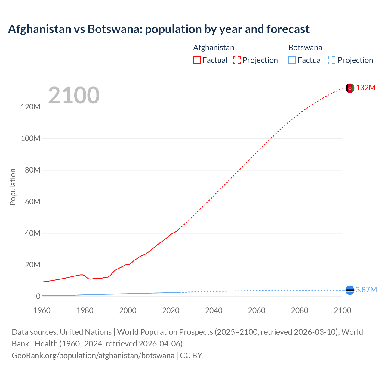 The latest officially reported population of Afghanistan was 42,647,492 in 2024 vs 2,521,139 people in Botswana in 2024. In 2026, based on the adjusted UN estimation, the current Afghanistan's population is 45,409,324 people compared to 2,615,162 in Botswana.