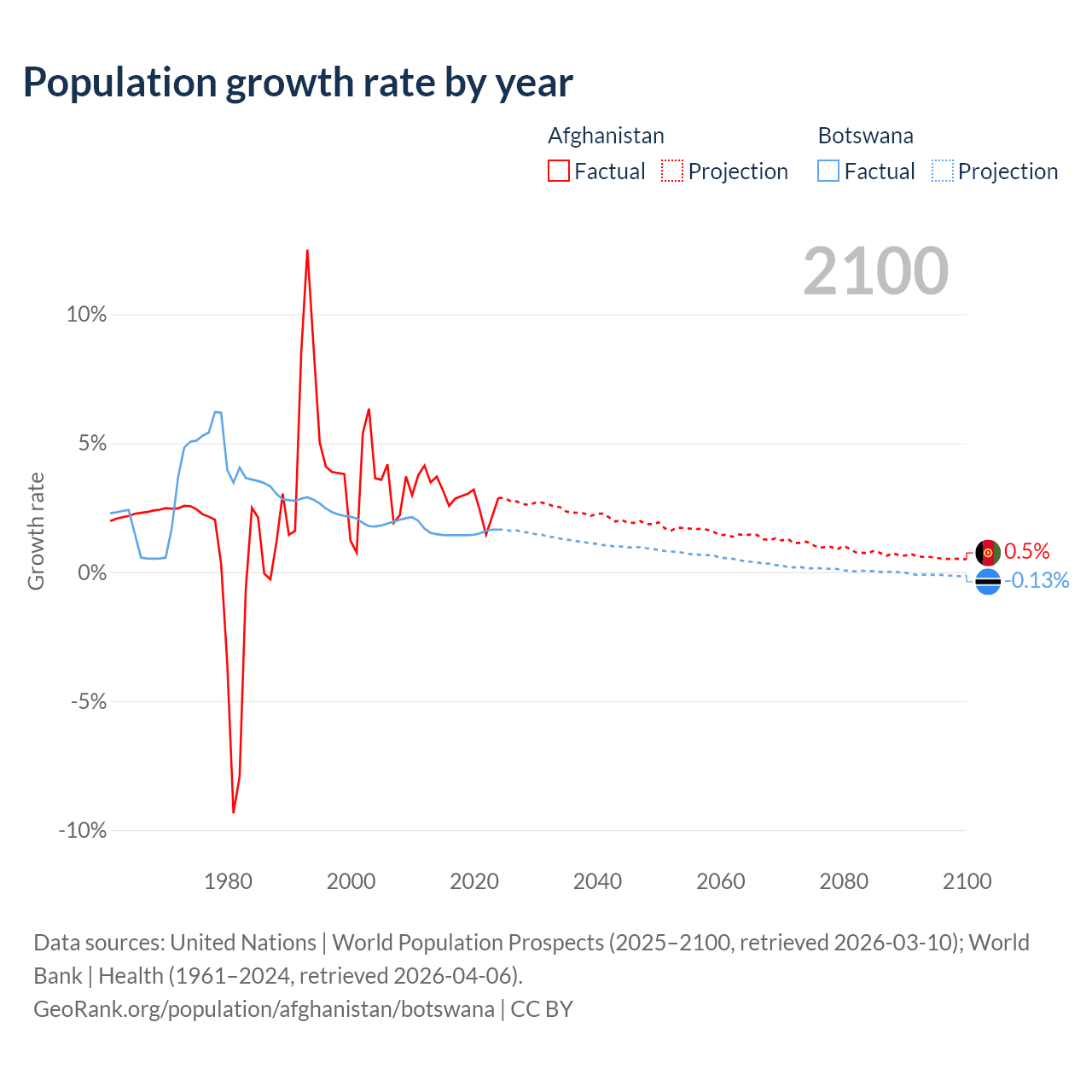 - For the last 10 years, Afghanistan has had an average growth rate of +2.76% per year vs +1.5% in Botswana.