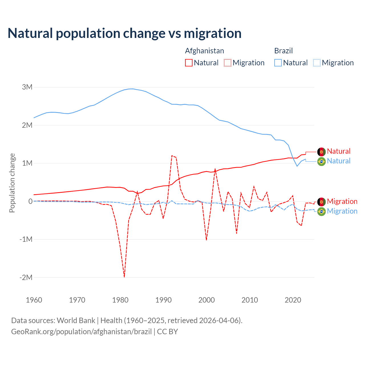 Over the last 10 years, 89% of the population change in Afghanistan is from natural causes (a gain of 11,292,049 people) and 11% is from migration (a loss of 1,396,045 people). In Brazil 89.1% is from natural causes (a gain of 14,004,164 people) and 10.9% is from migration (a loss of 1,708,894 people).
