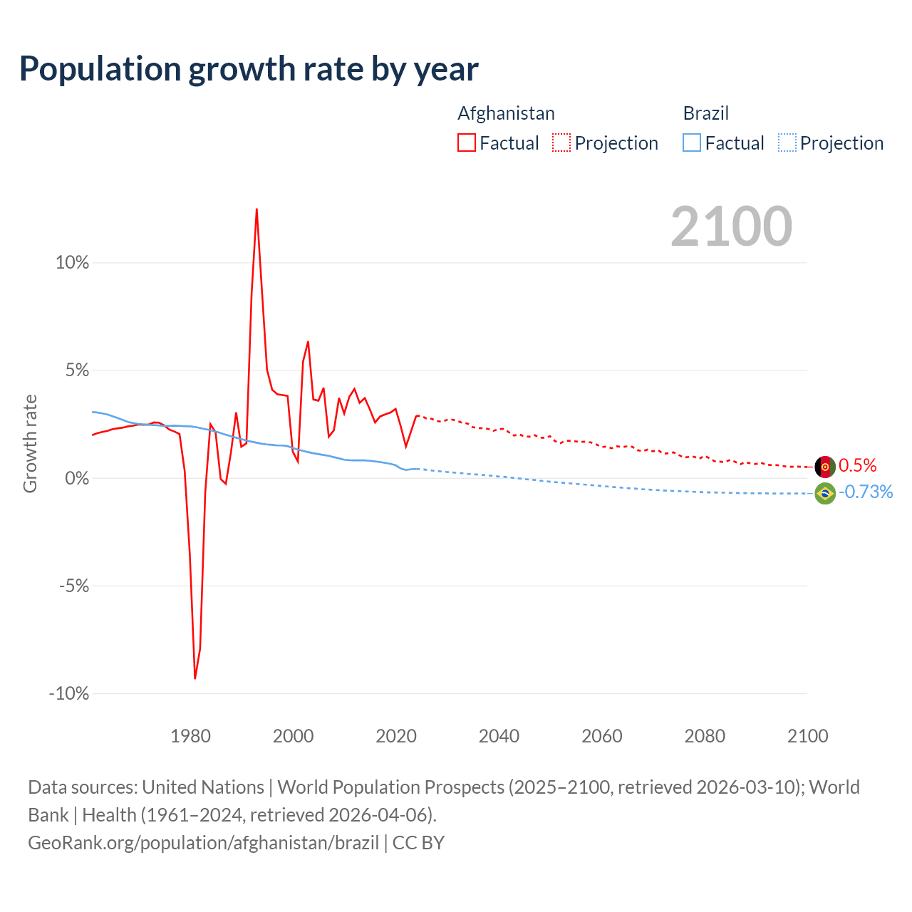 - For the last 10 years, Afghanistan has had an average growth rate of +2.76% per year vs +0.6% in Brazil.