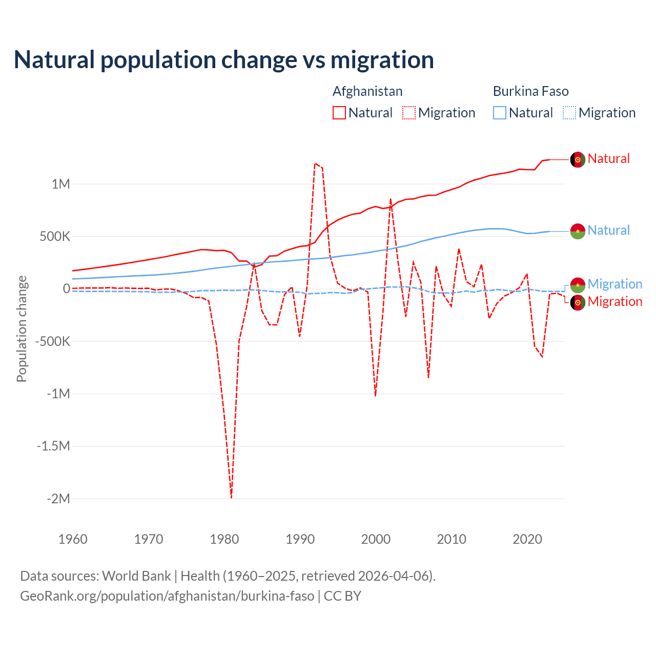 Over the last 10 years, 89% of the population change in Afghanistan is from natural causes (a gain of 11,292,049 people) and 11% is from migration (a loss of 1,396,045 people). In Burkina Faso 96.9% is from natural causes (a gain of 5,506,960 people) and 3.13% is from migration (a loss of 177,923 people).