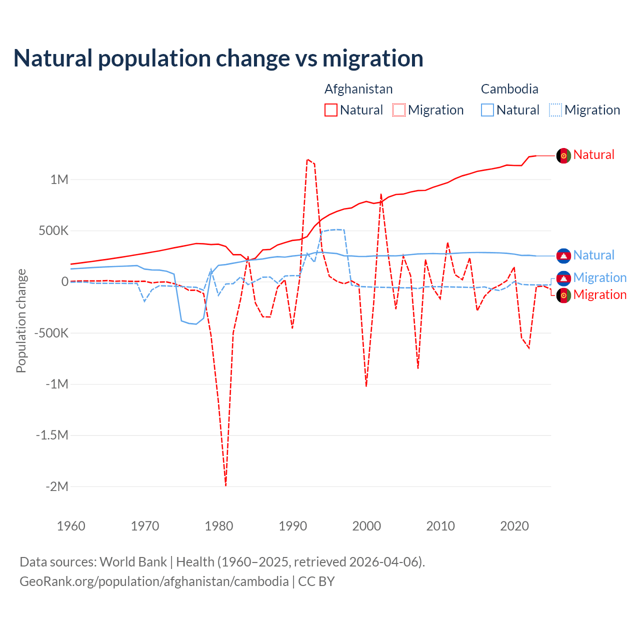 Over the last 10 years, 89% of the population change in Afghanistan is from natural causes (a gain of 11,292,049 people) and 11% is from migration (a loss of 1,396,045 people). In Cambodia 85.2% is from natural causes (a gain of 2,724,147 people) and 14.8% is from migration (a loss of 474,505 people).
