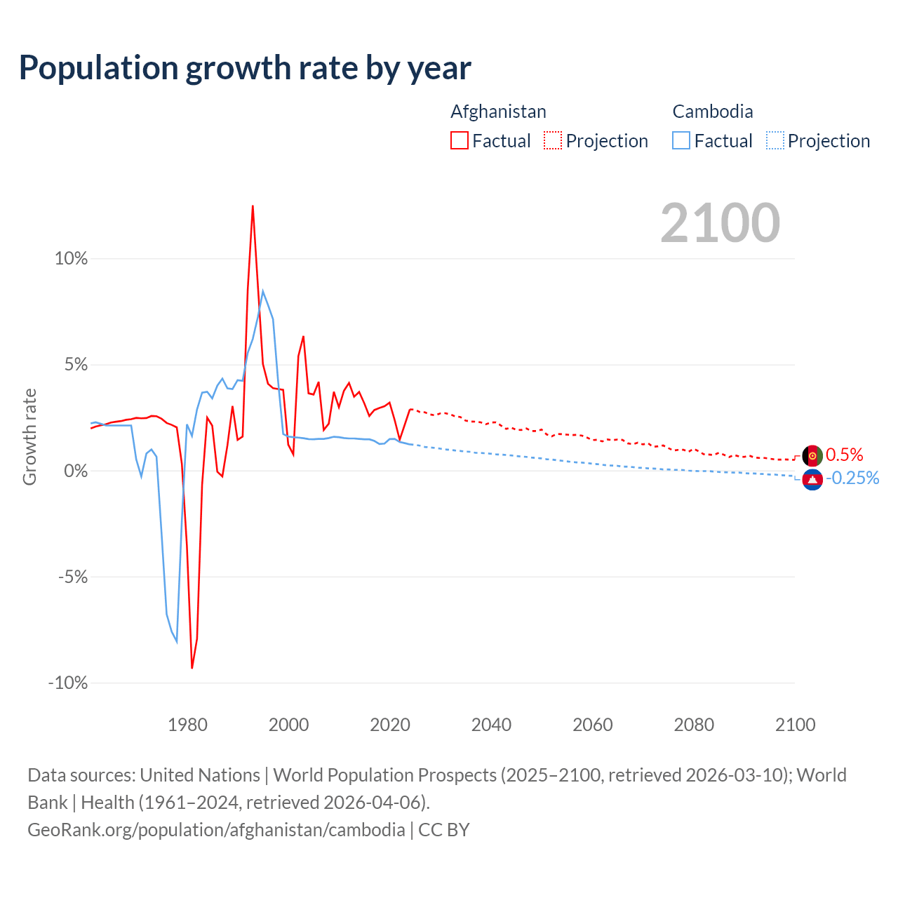 - For the last 10 years, Afghanistan has had an average growth rate of +2.76% per year vs +1.38% in Cambodia.