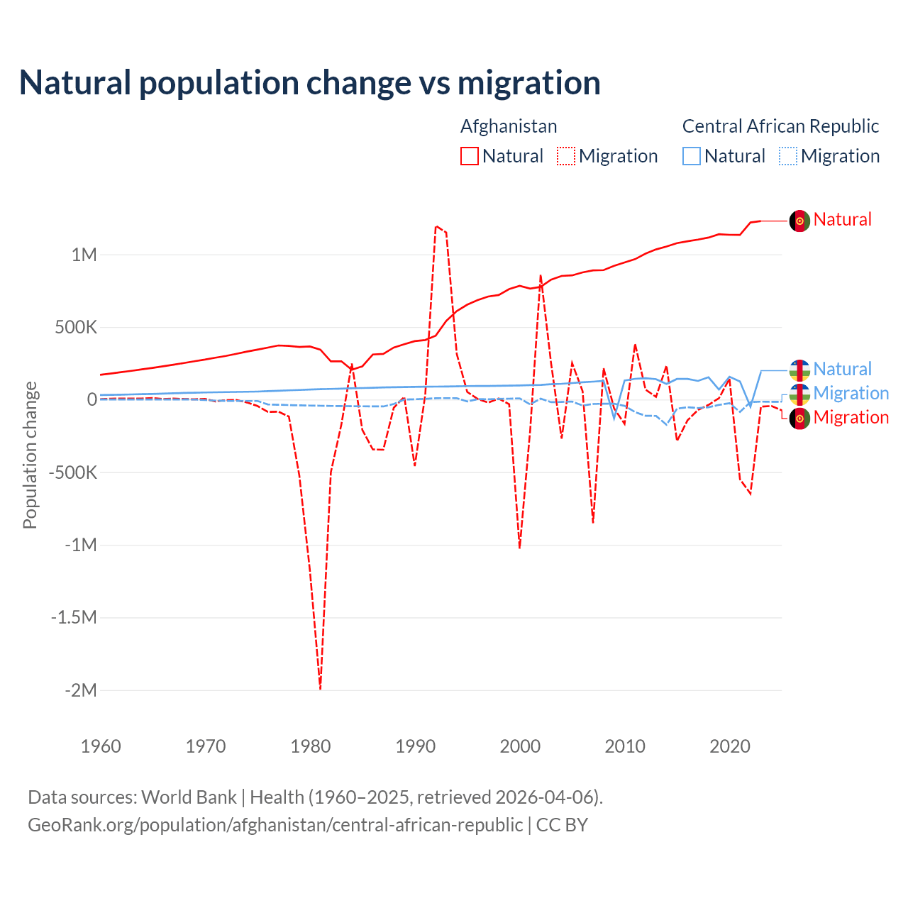 Over the last 10 years, 89% of the population change in Afghanistan is from natural causes (a gain of 11,292,049 people) and 11% is from migration (a loss of 1,396,045 people). In the Central African Republic 66.7% is from natural causes (a gain of 1,164,312 people) and 33.3% is from migration (a loss of 580,593 people).