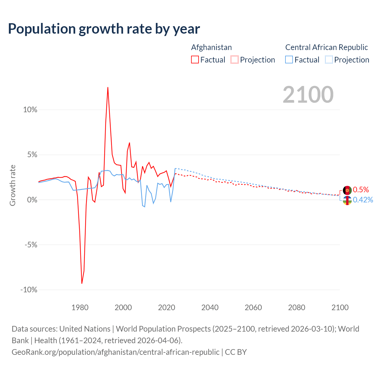 - For the last 10 years, Afghanistan has had an average growth rate of +2.76% per year vs +1.27% in the Central African Republic.
