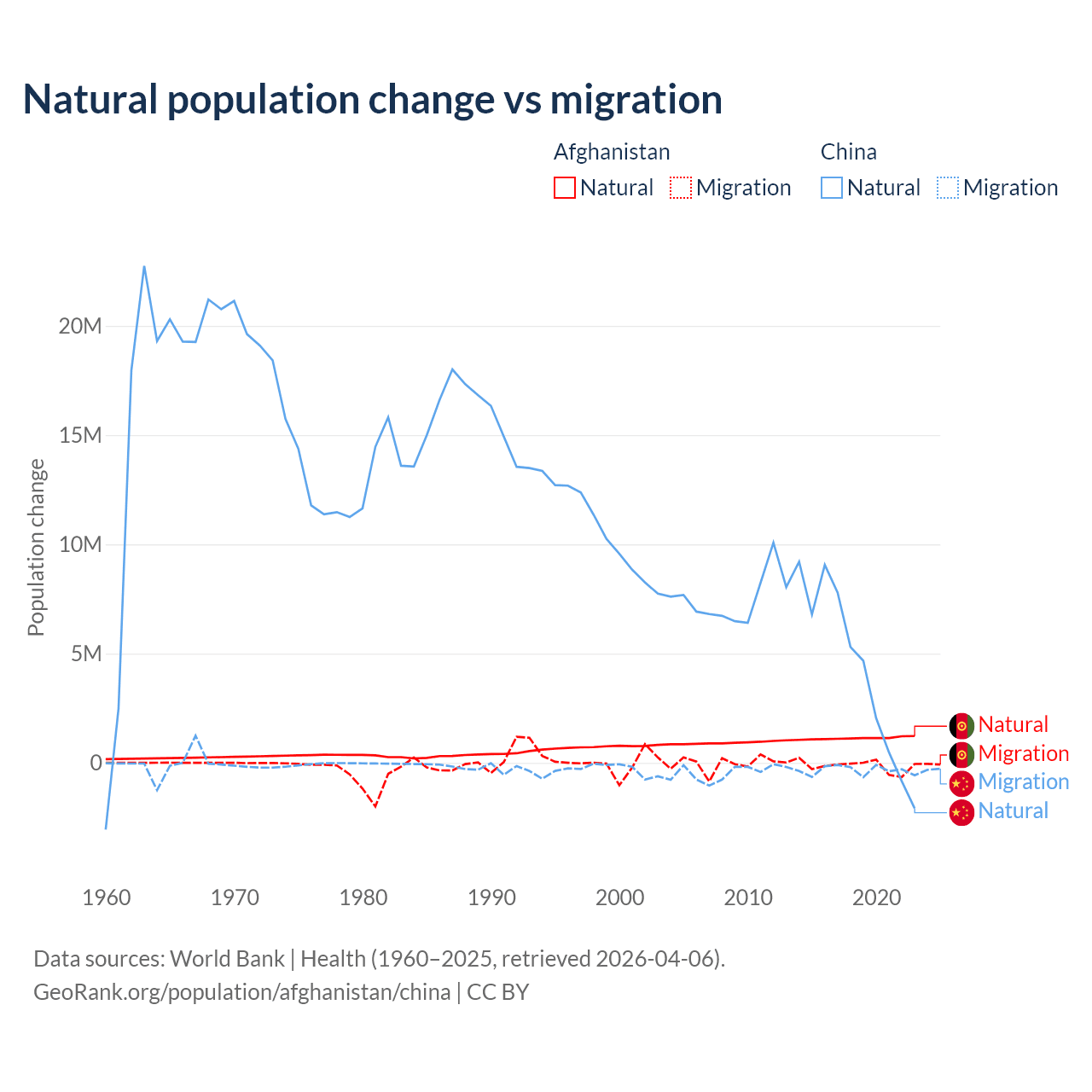 Over the last 10 years, 89% of the population change in Afghanistan is from natural causes (a gain of 11,292,049 people) and 11% is from migration (a loss of 1,396,045 people). In China 92.5% is from natural causes (a gain of 42,414,528 people) and 7.53% is from migration (a loss of 3,452,923 people).