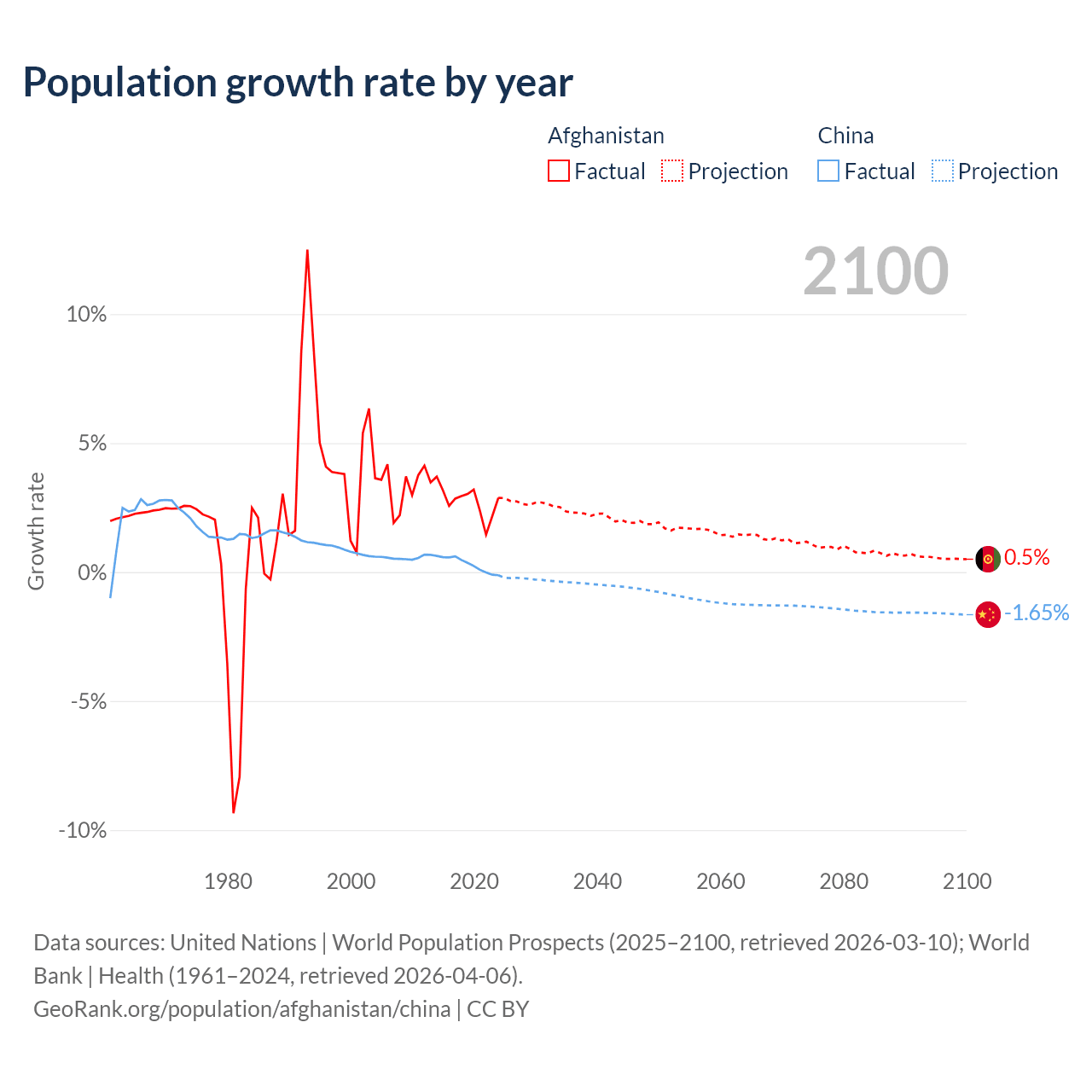 - For the last 10 years, Afghanistan has had an average growth rate of +2.76% per year vs +0.3% in China.