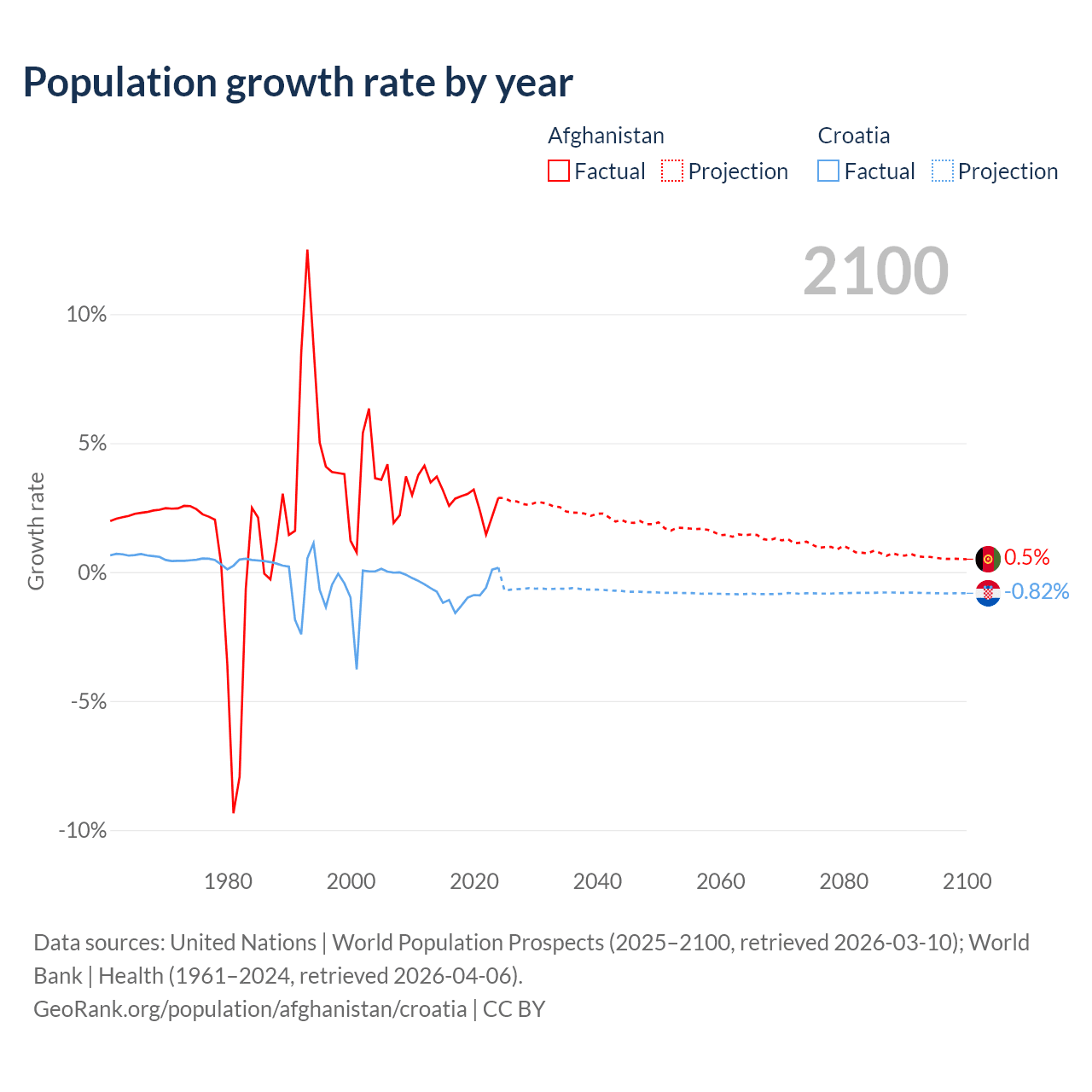- For the last 10 years, Afghanistan has had an average growth rate of +2.76% per year vs -0.82% in Croatia.