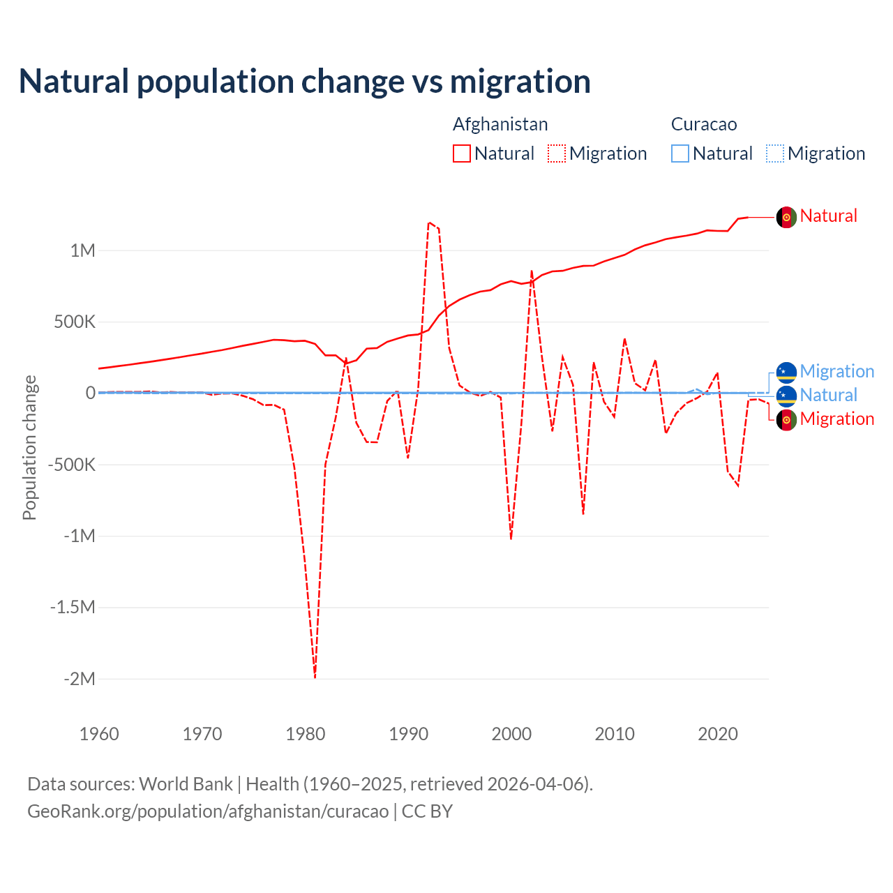 Over the last 10 years, 89% of the population change in Afghanistan is from natural causes (a gain of 11,292,049 people) and 11% is from migration (a loss of 1,396,045 people). In Curacao 3.72% is from natural causes (a gain of 834 people) and 96.3% is from migration (a gain of 21,615 people).