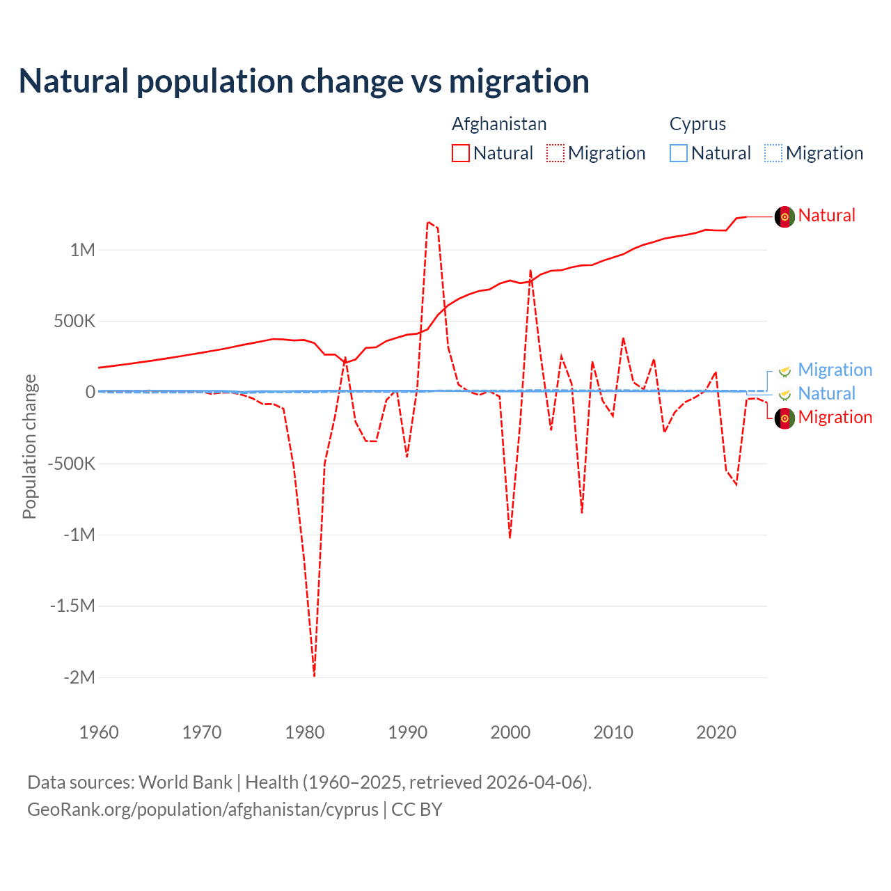 Over the last 10 years, 89% of the population change in Afghanistan is from natural causes (a gain of 11,292,049 people) and 11% is from migration (a loss of 1,396,045 people). In Cyprus 36.2% is from natural causes (a gain of 57,464 people) and 63.8% is from migration (a gain of 101,458 people).