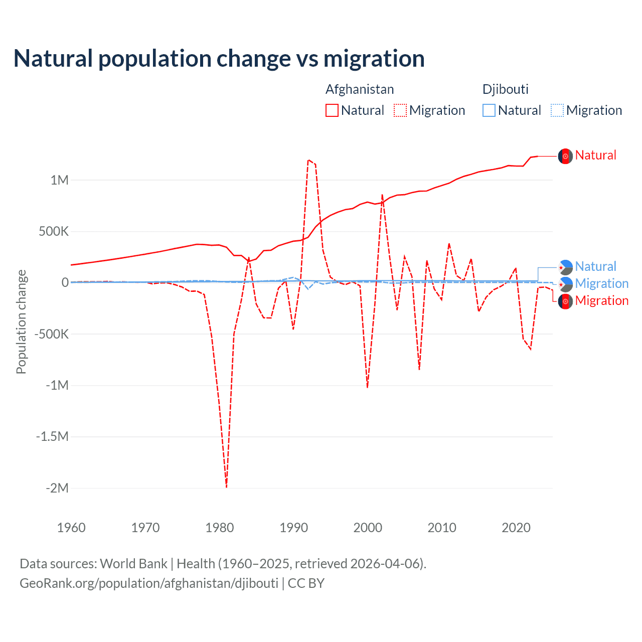 Over the last 10 years, 89% of the population change in Afghanistan is from natural causes (a gain of 11,292,049 people) and 11% is from migration (a loss of 1,396,045 people). In Djibouti 92.1% is from natural causes (a gain of 153,892 people) and 7.87% is from migration (a gain of 13,138 people).
