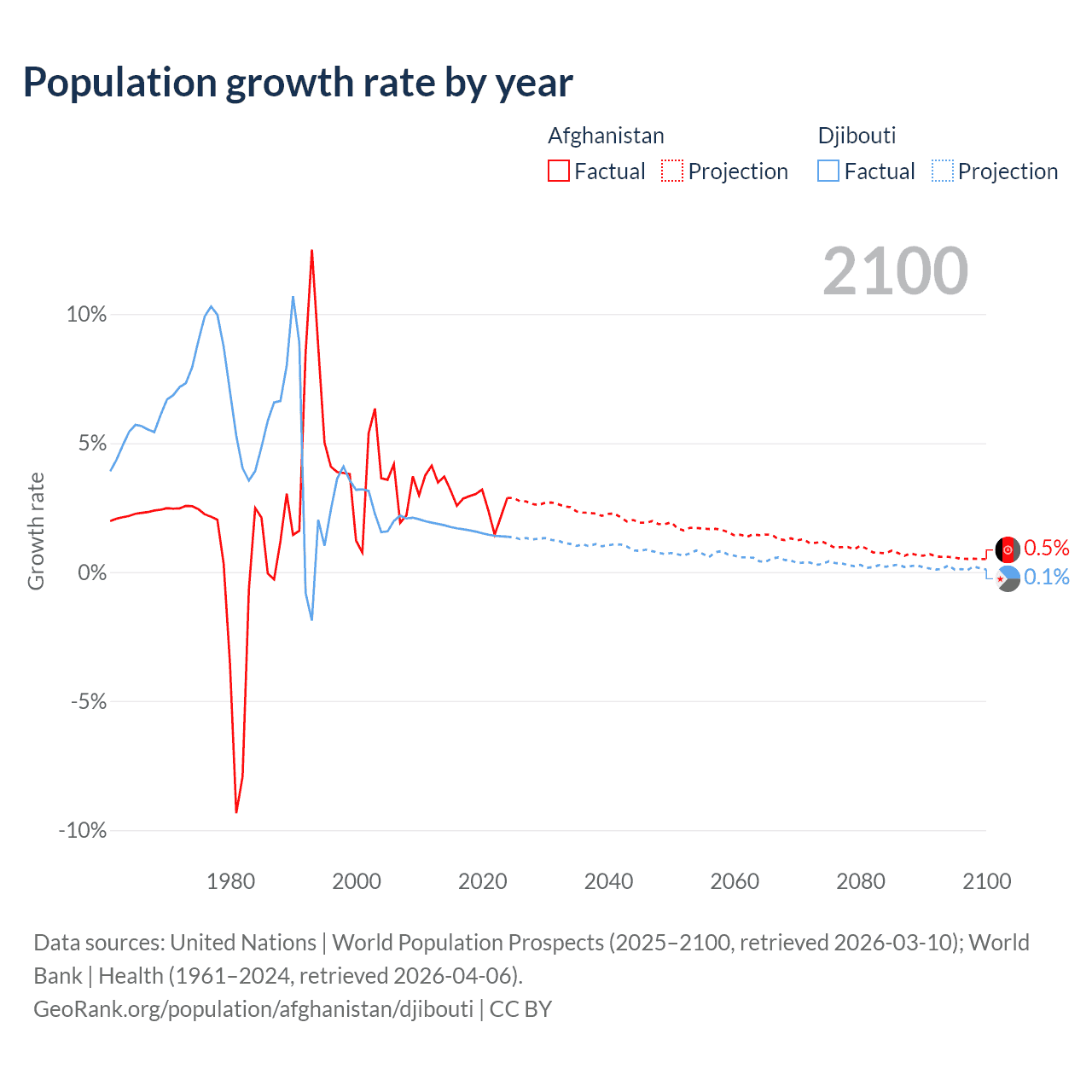 - For the last 10 years, Afghanistan has had an average growth rate of +2.76% per year vs +1.57% in Djibouti.
