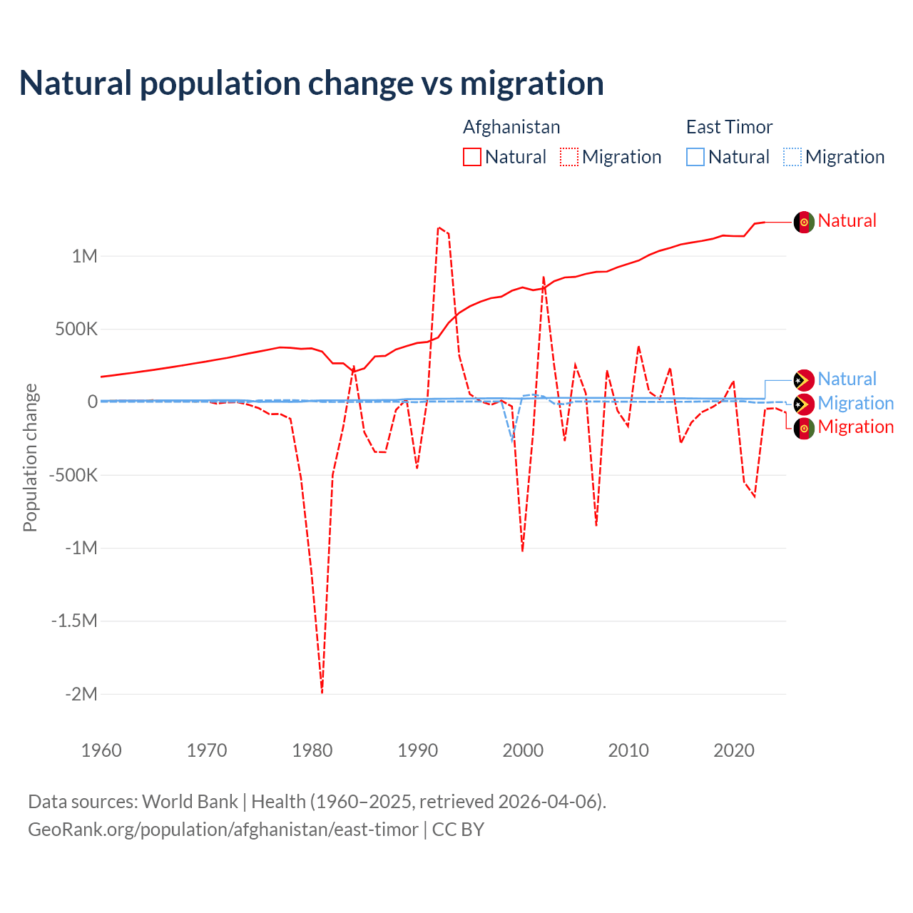 Over the last 10 years, 89% of the population change in Afghanistan is from natural causes (a gain of 11,292,049 people) and 11% is from migration (a loss of 1,396,045 people). In East Timor 98.3% is from natural causes (a gain of 217,698 people) and 1.66% is from migration (a gain of 3,665 people).