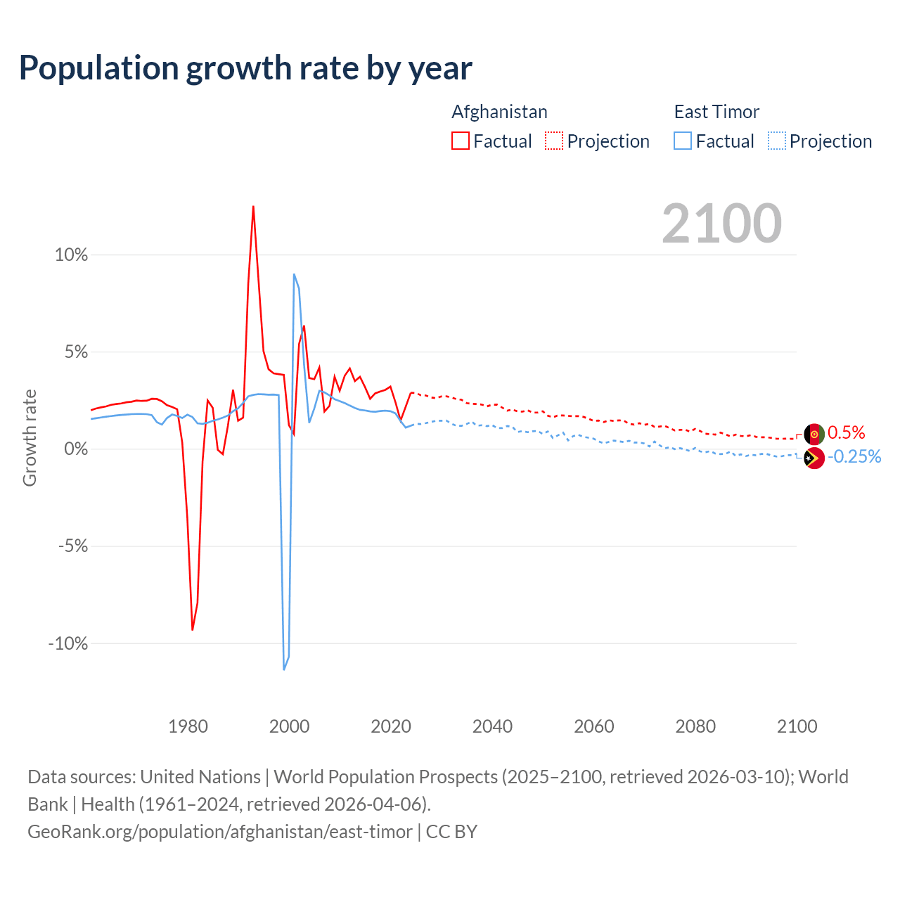 - For the last 10 years, Afghanistan has had an average growth rate of +2.76% per year vs +1.74% in East Timor.