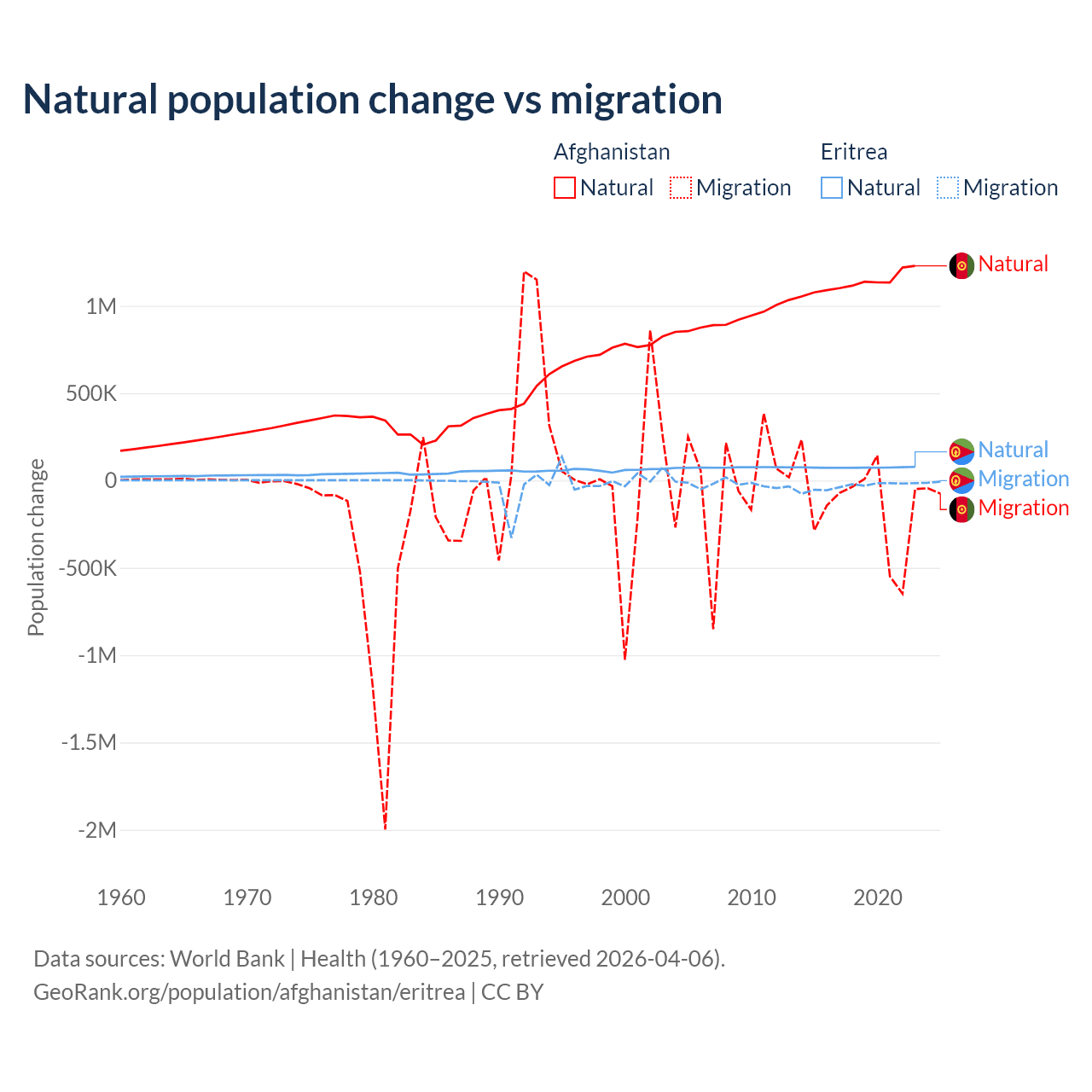 Over the last 10 years, 89% of the population change in Afghanistan is from natural causes (a gain of 11,292,049 people) and 11% is from migration (a loss of 1,396,045 people). In Eritrea 68.8% is from natural causes (a gain of 742,837 people) and 31.2% is from migration (a loss of 336,243 people).