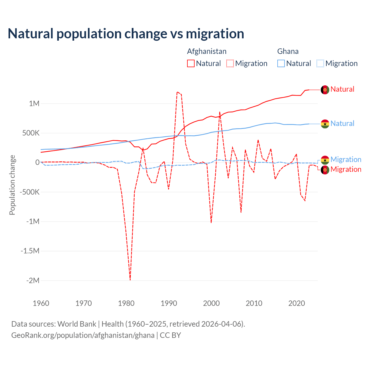 Over the last 10 years, 89% of the population change in Afghanistan is from natural causes (a gain of 11,292,049 people) and 11% is from migration (a loss of 1,396,045 people). In Ghana 98.6% is from natural causes (a gain of 6,484,449 people) and 1.37% is from migration (a loss of 90,310 people).