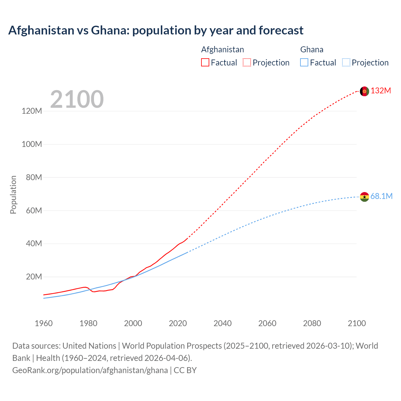 Afghanistan vs Ghana: population by year and forecast