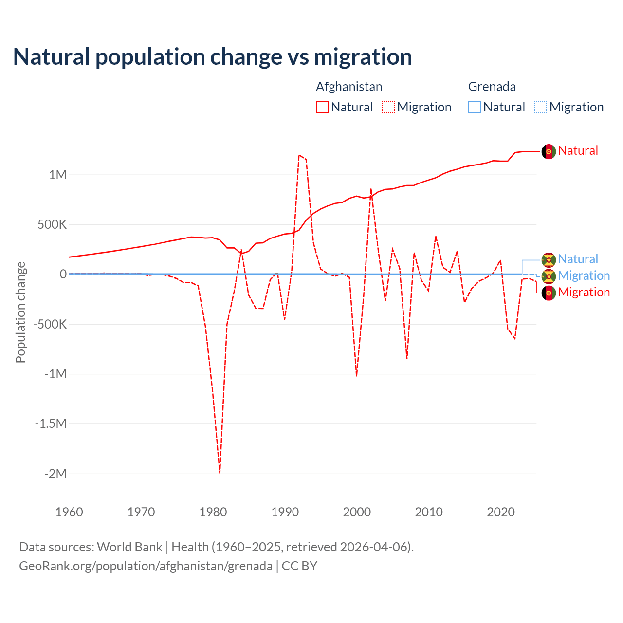 Over the last 10 years, 89% of the population change in Afghanistan is from natural causes (a gain of 11,292,049 people) and 11% is from migration (a loss of 1,396,045 people). In Grenada 76% is from natural causes (a gain of 4,850 people) and 24% is from migration (a loss of 1,535 people).