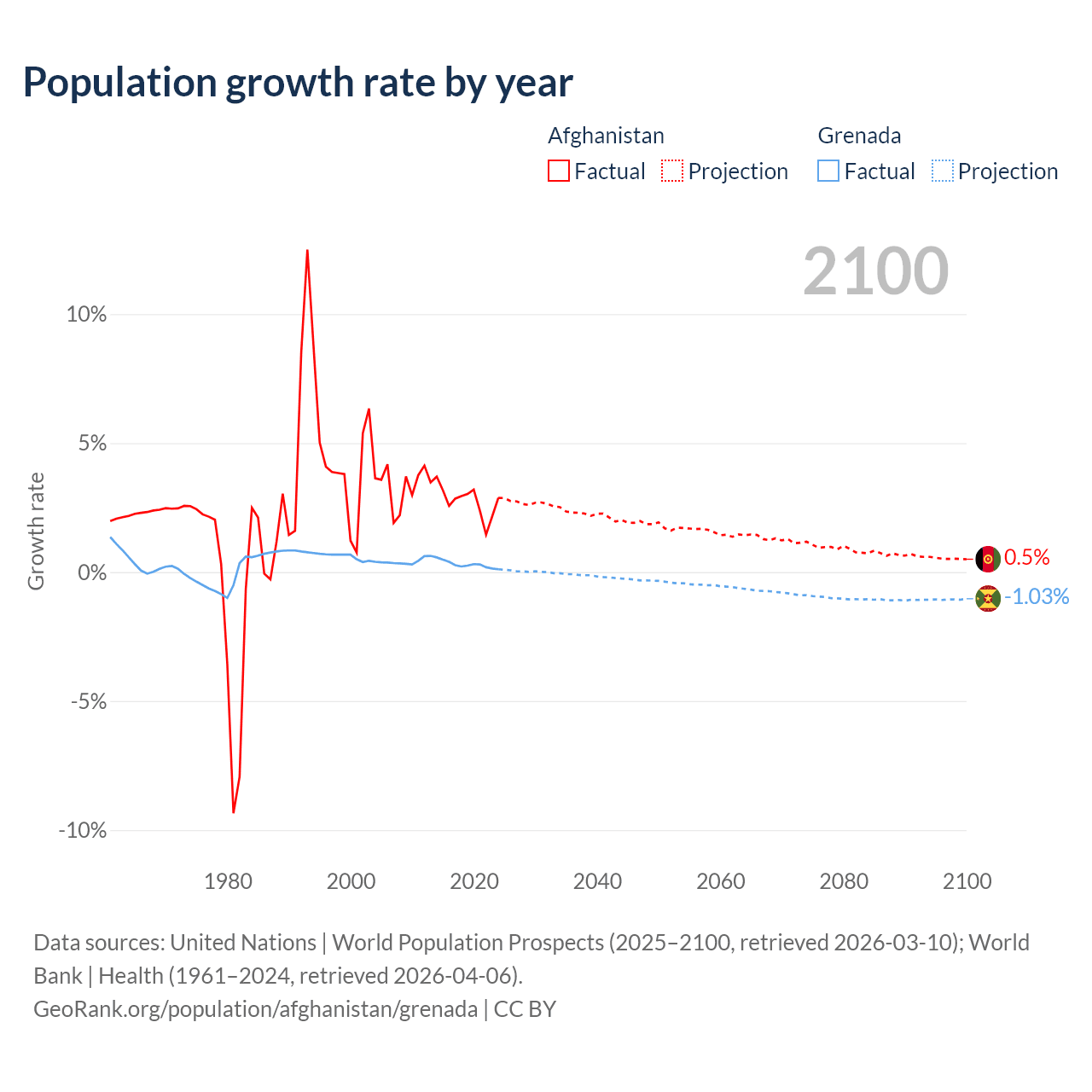 - For the last 10 years, Afghanistan has had an average growth rate of +2.76% per year vs +0.29% in Grenada.
