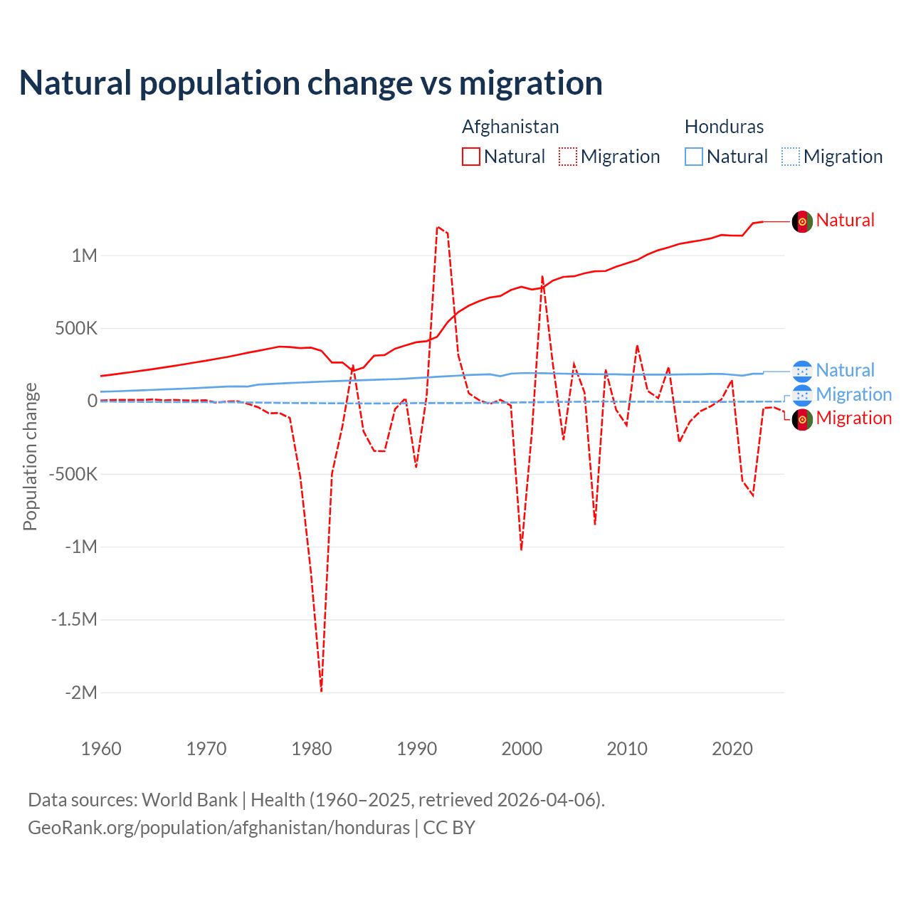 Over the last 10 years, 89% of the population change in Afghanistan is from natural causes (a gain of 11,292,049 people) and 11% is from migration (a loss of 1,396,045 people). In Honduras 96.7% is from natural causes (a gain of 1,821,125 people) and 3.29% is from migration (a loss of 61,965 people).