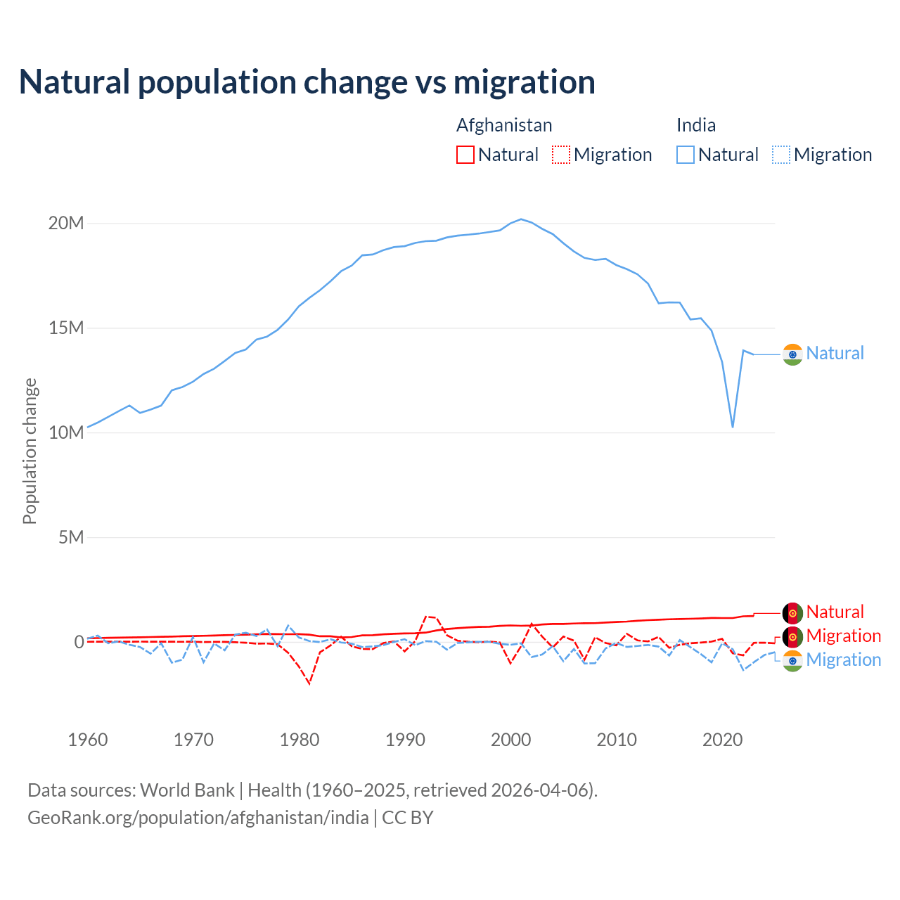 Over the last 10 years, 89% of the population change in Afghanistan is from natural causes (a gain of 11,292,049 people) and 11% is from migration (a loss of 1,396,045 people). In India 96.4% is from natural causes (a gain of 145,503,378 people) and 3.56% is from migration (a loss of 5,376,884 people).