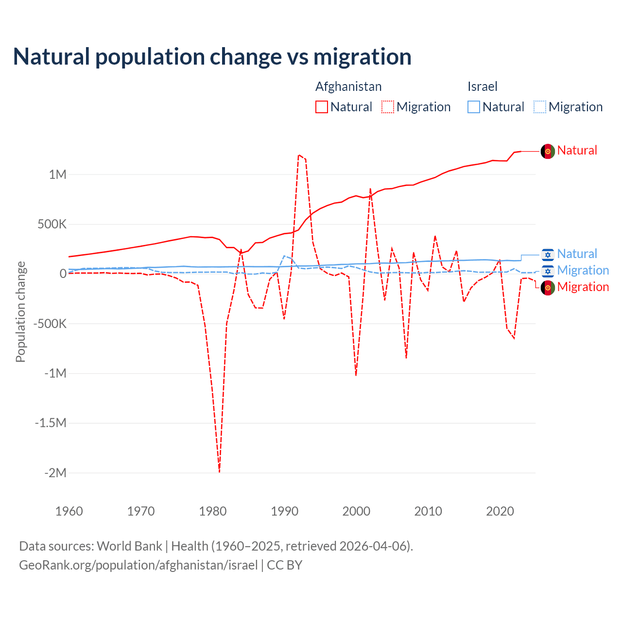 Over the last 10 years, 89% of the population change in Afghanistan is from natural causes (a gain of 11,292,049 people) and 11% is from migration (a loss of 1,396,045 people). In Israel 86% is from natural causes (a gain of 1,343,492 people) and 14% is from migration (a gain of 219,048 people).
