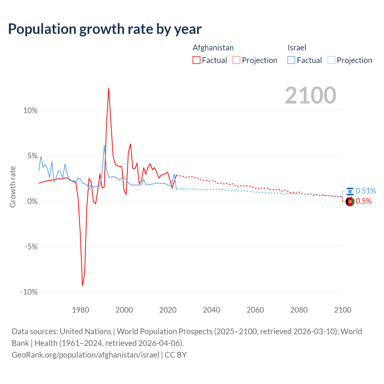 - For the last 10 years, Afghanistan has had an average growth rate of +2.76% per year vs +1.96% in Israel.