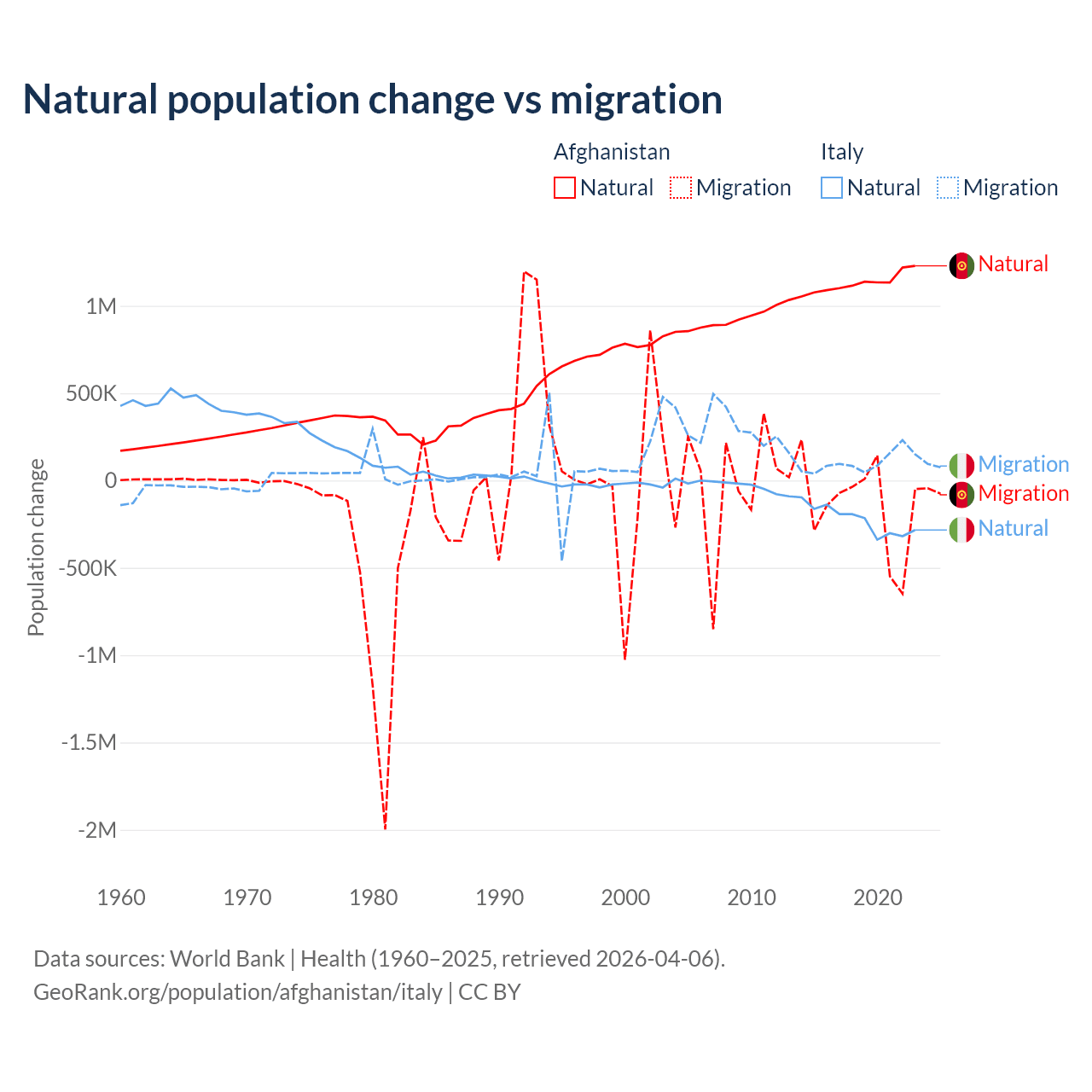 Over the last 10 years, 89% of the population change in Afghanistan is from natural causes (a gain of 11,292,049 people) and 11% is from migration (a loss of 1,396,045 people). In Italy 68.6% is from natural causes (a loss of 2,239,084 people) and 31.4% is from migration (a gain of 1,026,128 people).