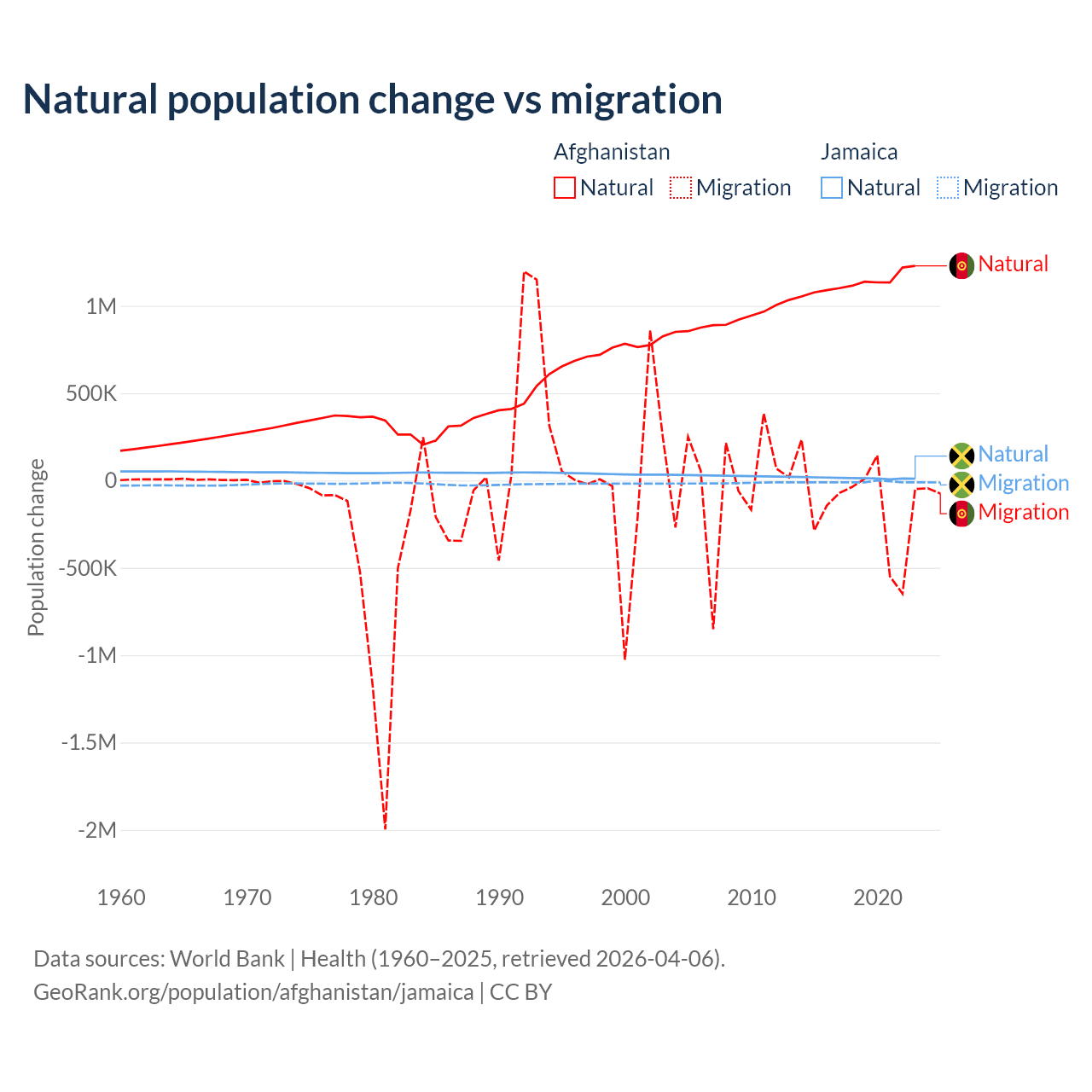 Over the last 10 years, 89% of the population change in Afghanistan is from natural causes (a gain of 11,292,049 people) and 11% is from migration (a loss of 1,396,045 people). In Jamaica 61.3% is from natural causes (a gain of 137,465 people) and 38.7% is from migration (a loss of 86,681 people).