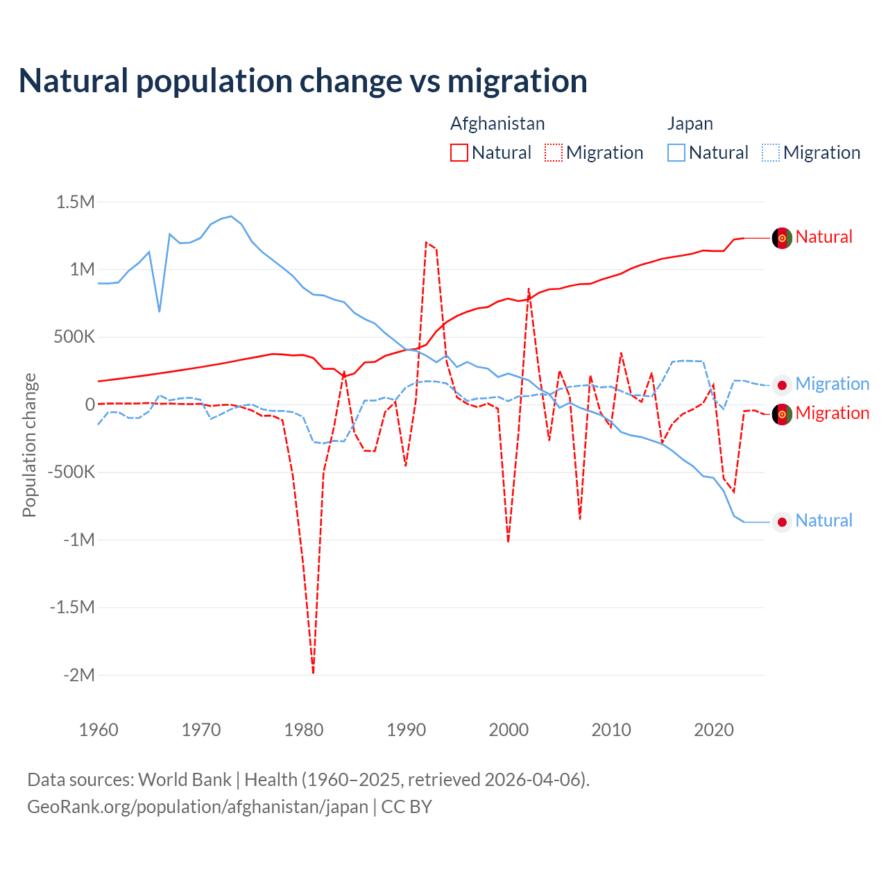Over the last 10 years, 89% of the population change in Afghanistan is from natural causes (a gain of 11,292,049 people) and 11% is from migration (a loss of 1,396,045 people). In Japan 73.6% is from natural causes (a loss of 5,178,838 people) and 26.4% is from migration (a gain of 1,860,103 people).