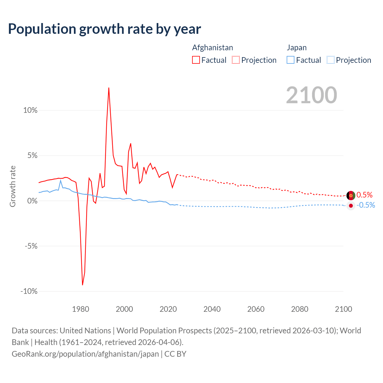 - For the last 10 years, Afghanistan has had an average growth rate of +2.76% per year vs -0.25% in Japan.