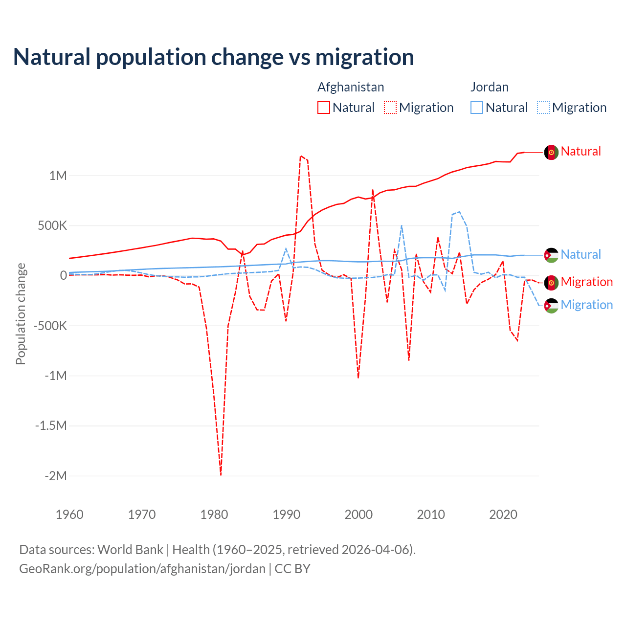 Over the last 10 years, 89% of the population change in Afghanistan is from natural causes (a gain of 11,292,049 people) and 11% is from migration (a loss of 1,396,045 people). In Jordan 63.2% is from natural causes (a gain of 1,991,452 people) and 36.8% is from migration (a gain of 1,157,625 people).