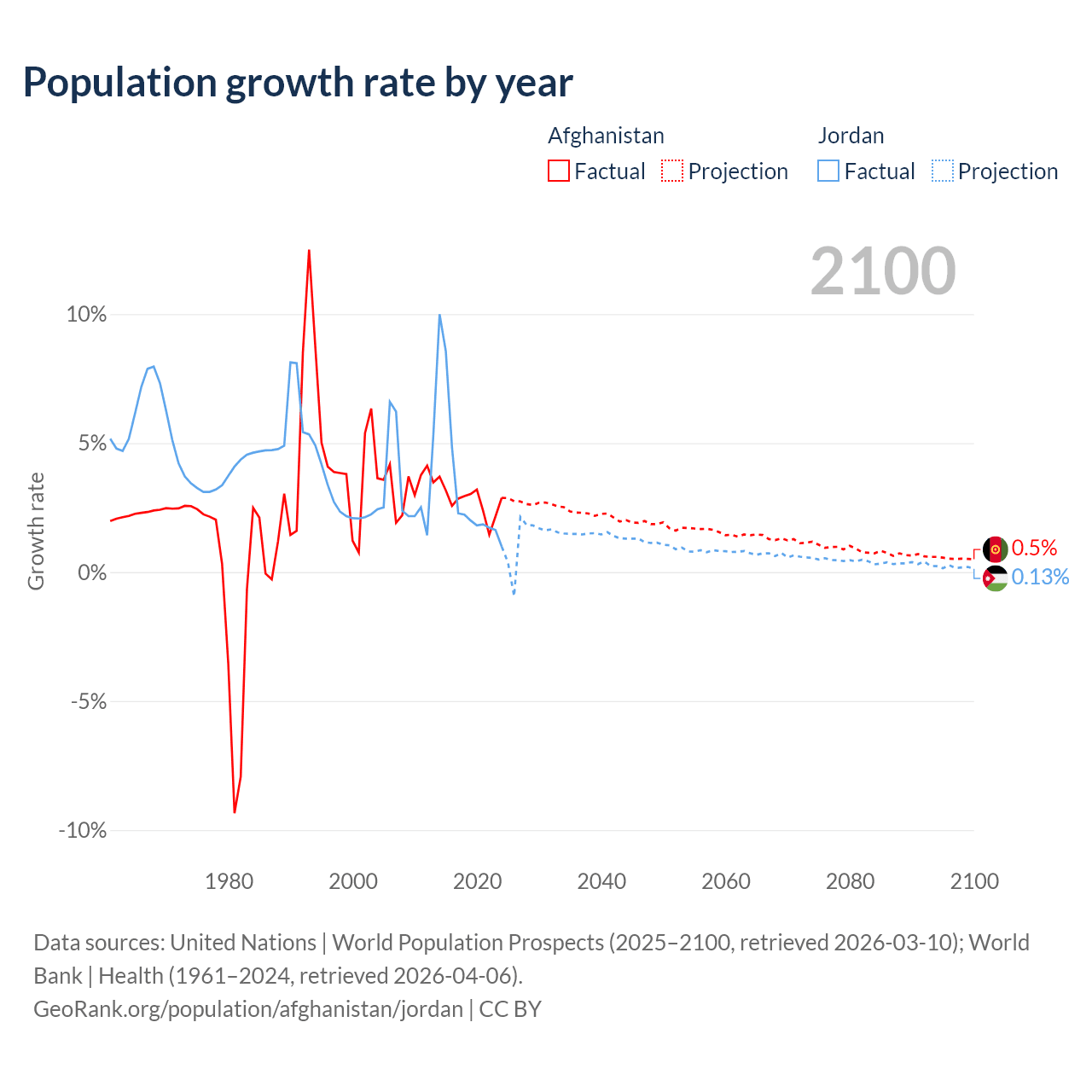 - For the last 10 years, Afghanistan has had an average growth rate of +2.76% per year vs +3.45% in Jordan.