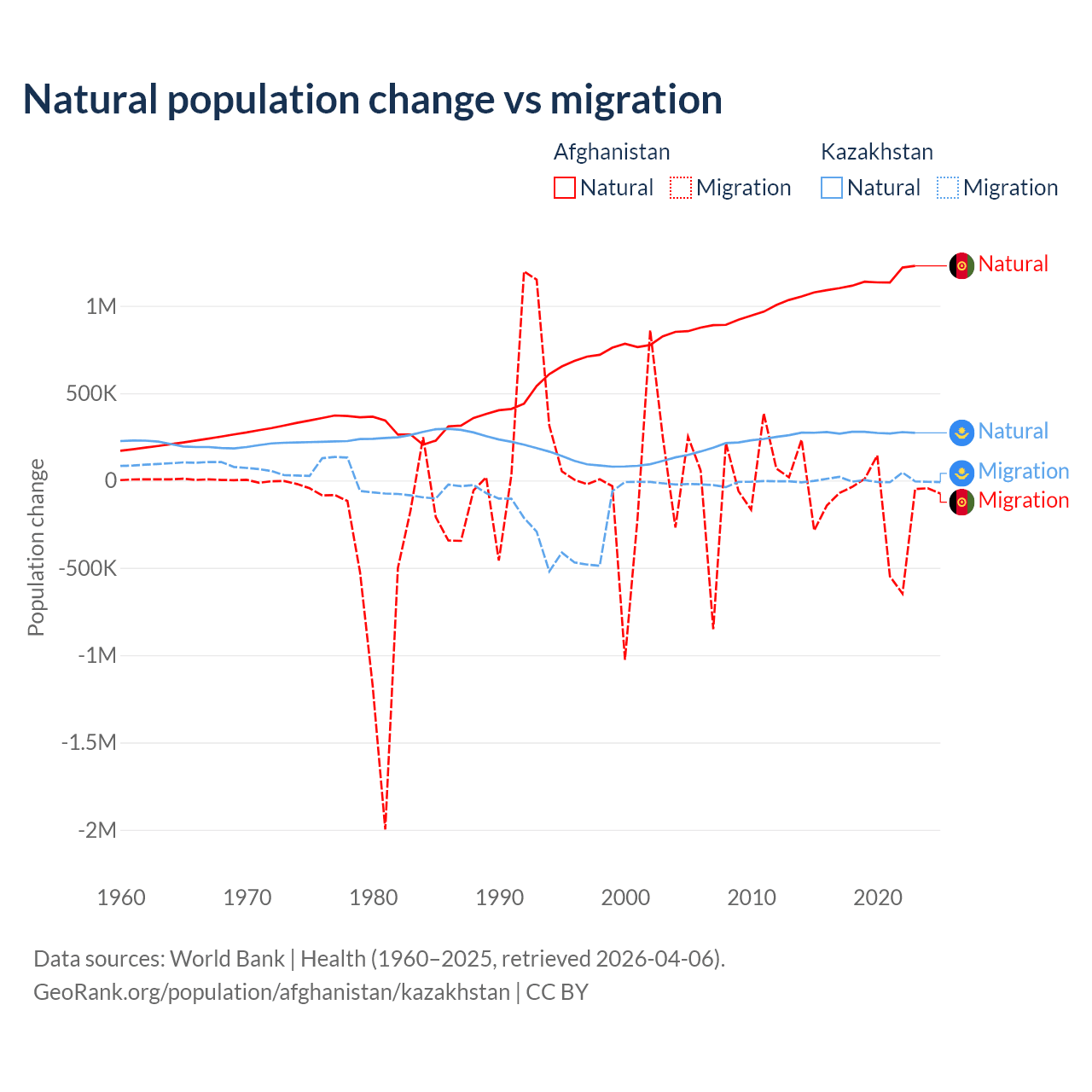 Over the last 10 years, 89% of the population change in Afghanistan is from natural causes (a gain of 11,292,049 people) and 11% is from migration (a loss of 1,396,045 people). In Kazakhstan 98.7% is from natural causes (a gain of 2,743,094 people) and 1.33% is from migration (a gain of 36,908 people).