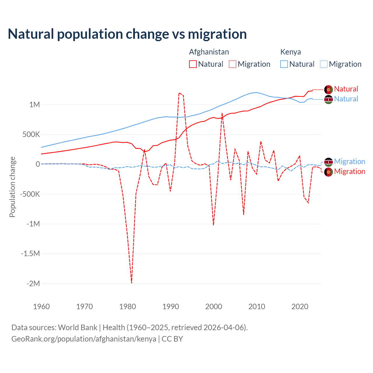 Over the last 10 years, 89% of the population change in Afghanistan is from natural causes (a gain of 11,292,049 people) and 11% is from migration (a loss of 1,396,045 people). In Kenya 95.3% is from natural causes (a gain of 10,892,362 people) and 4.67% is from migration (a loss of 533,876 people).