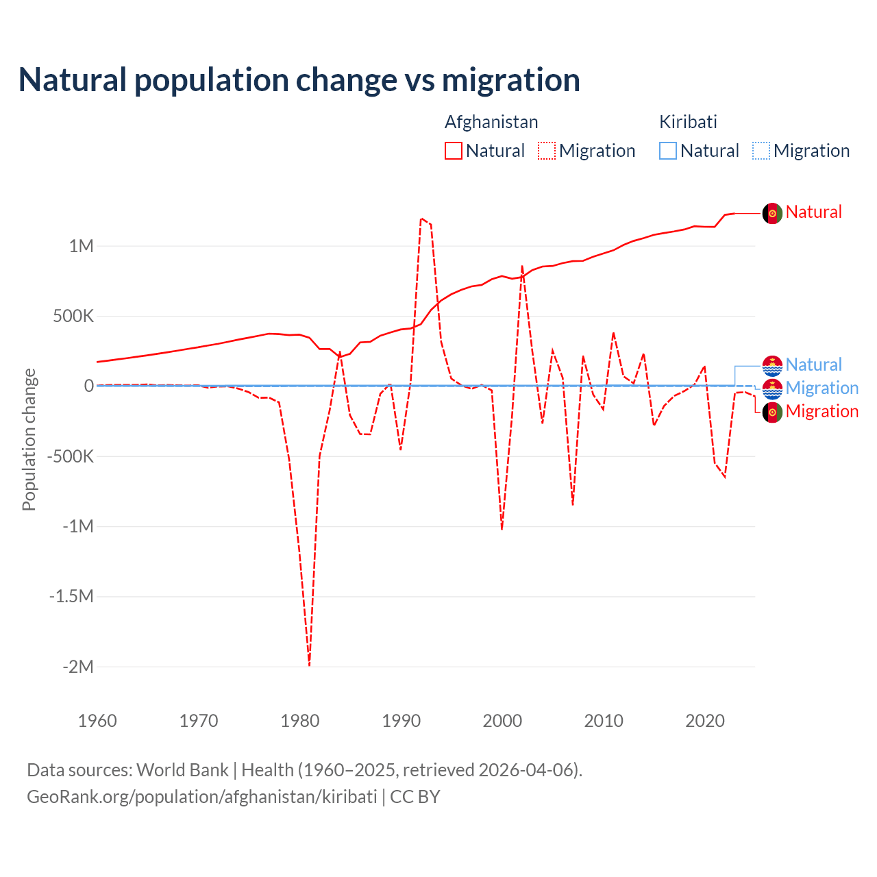 Over the last 10 years, 89% of the population change in Afghanistan is from natural causes (a gain of 11,292,049 people) and 11% is from migration (a loss of 1,396,045 people). In Kiribati 80% is from natural causes (a gain of 25,262 people) and 20% is from migration (a loss of 6,330 people).