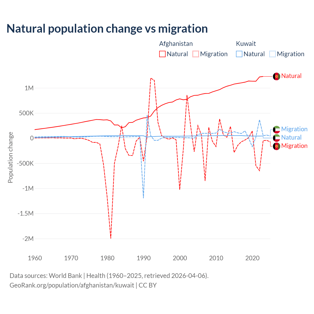 Over the last 10 years, 89% of the population change in Afghanistan is from natural causes (a gain of 11,292,049 people) and 11% is from migration (a loss of 1,396,045 people). In Kuwait 35.8% is from natural causes (a gain of 470,645 people) and 64.2% is from migration (a gain of 845,142 people).