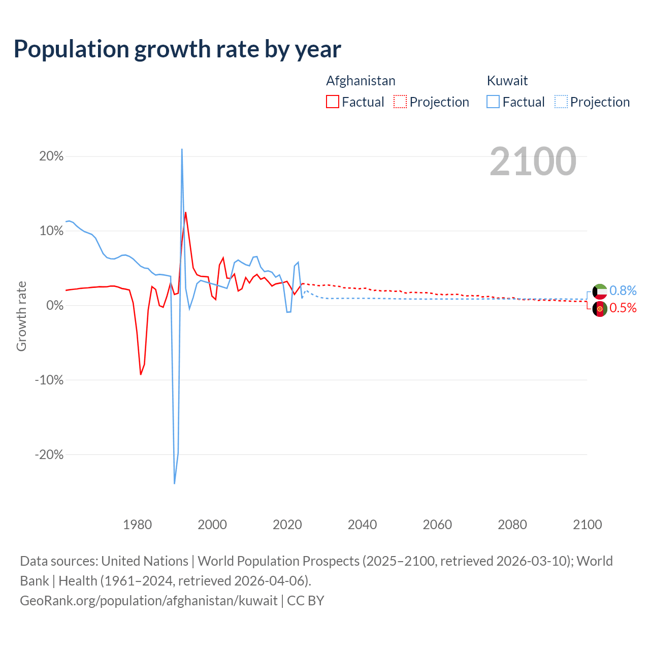 - For the last 10 years, Afghanistan has had an average growth rate of +2.76% per year vs +3.1% in Kuwait.