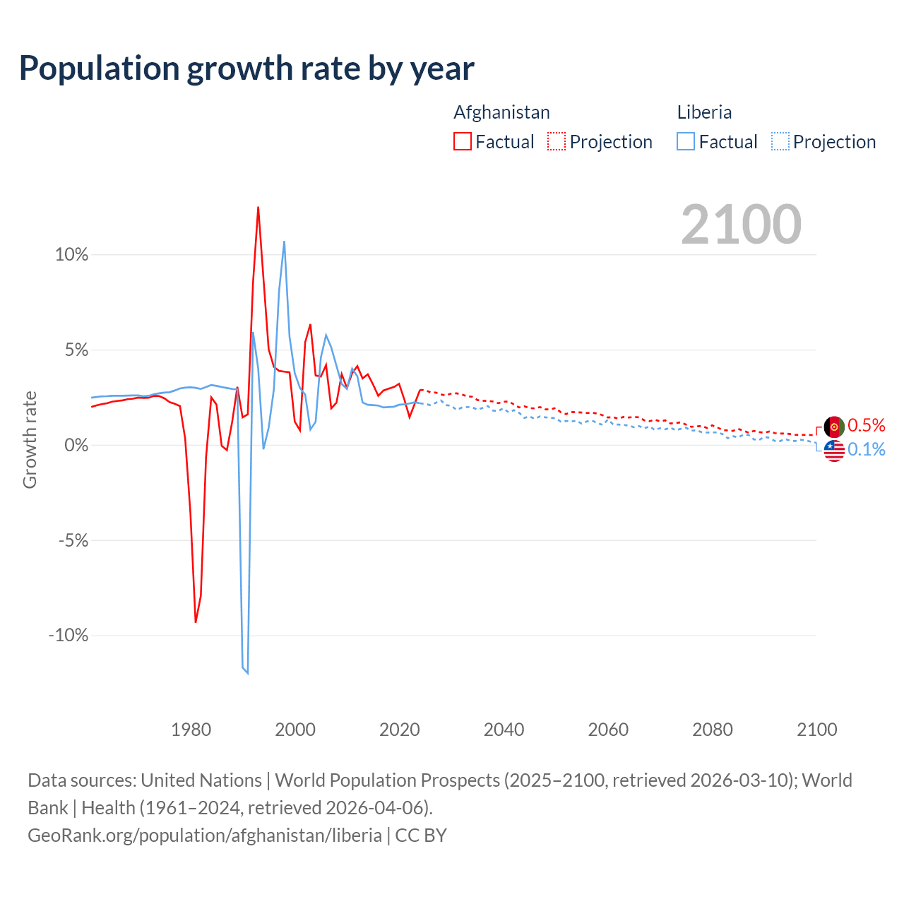 - For the last 10 years, Afghanistan has had an average growth rate of +2.76% per year vs +2.09% in Liberia.