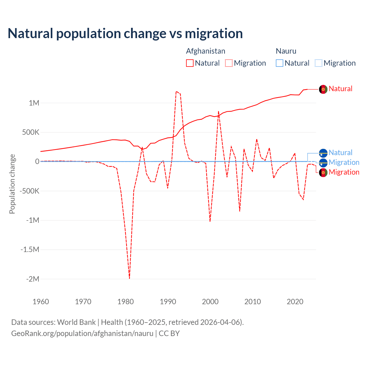 Over the last 10 years, 89% of the population change in Afghanistan is from natural causes (a gain of 11,292,049 people) and 11% is from migration (a loss of 1,396,045 people). In Nauru 66.2% is from natural causes (a gain of 2,590 people) and 33.8% is from migration (a loss of 1,320 people).