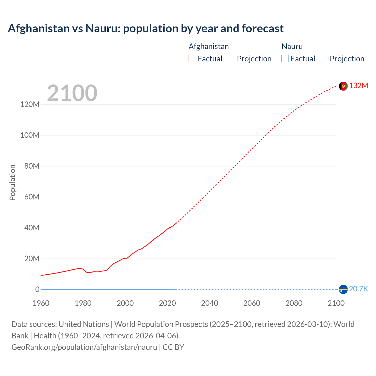 The latest officially reported population of Afghanistan was 42,647,492 in 2024 vs 11,947 people in Nauru in 2024. In 2026, based on the adjusted UN estimation, the current Afghanistan's population is 45,409,324 people compared to 12,125 in Nauru.