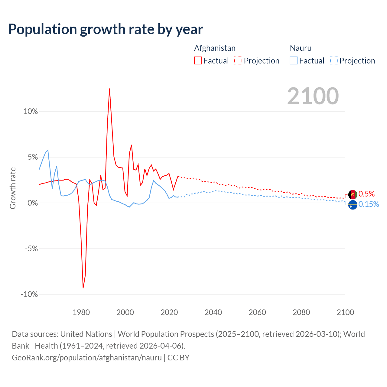 - For the last 10 years, Afghanistan has had an average growth rate of +2.76% per year vs +1.17% in Nauru.