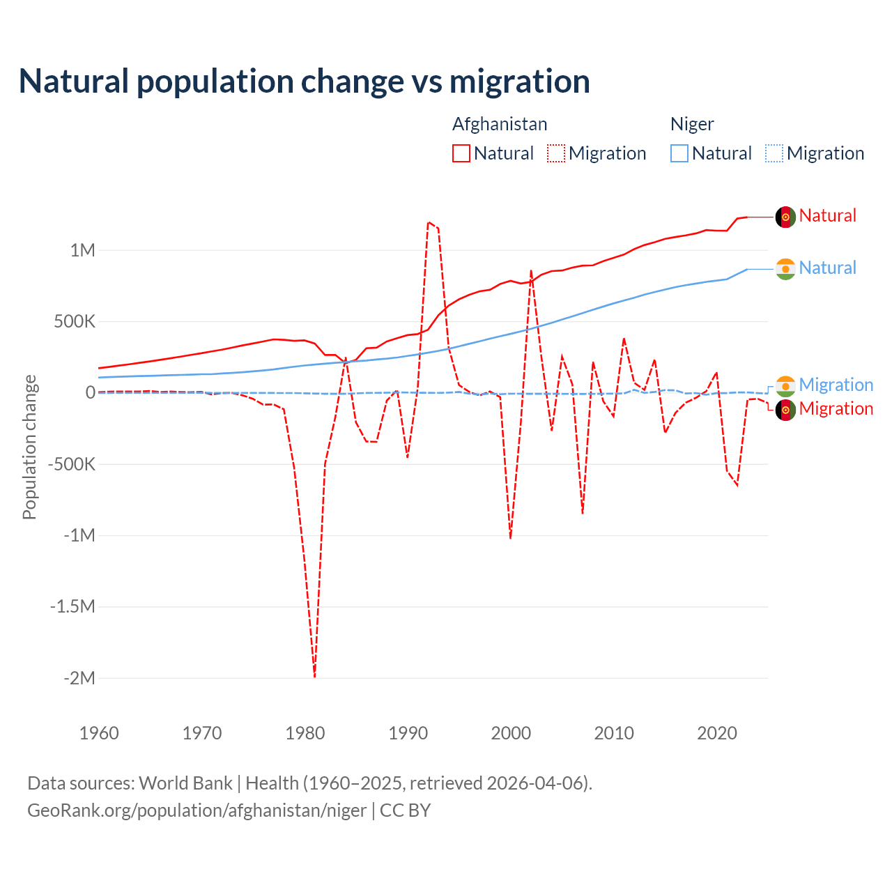 Over the last 10 years, 89% of the population change in Afghanistan is from natural causes (a gain of 11,292,049 people) and 11% is from migration (a loss of 1,396,045 people). In Niger 100% is from natural causes (a gain of 7,728,287 people) and 0.03% is from migration (a gain of 2,520 people).
