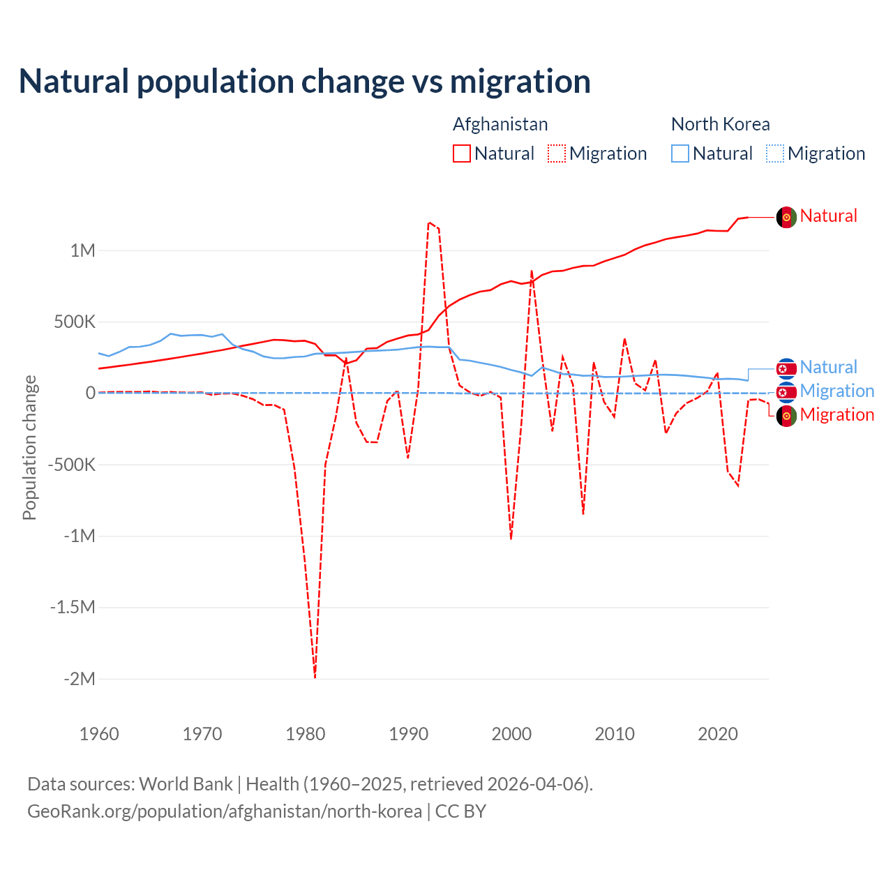 Over the last 10 years, 89% of the population change in Afghanistan is from natural causes (a gain of 11,292,049 people) and 11% is from migration (a loss of 1,396,045 people). In North Korea 97.7% is from natural causes (a gain of 1,097,372 people) and 2.33% is from migration (a loss of 26,227 people).