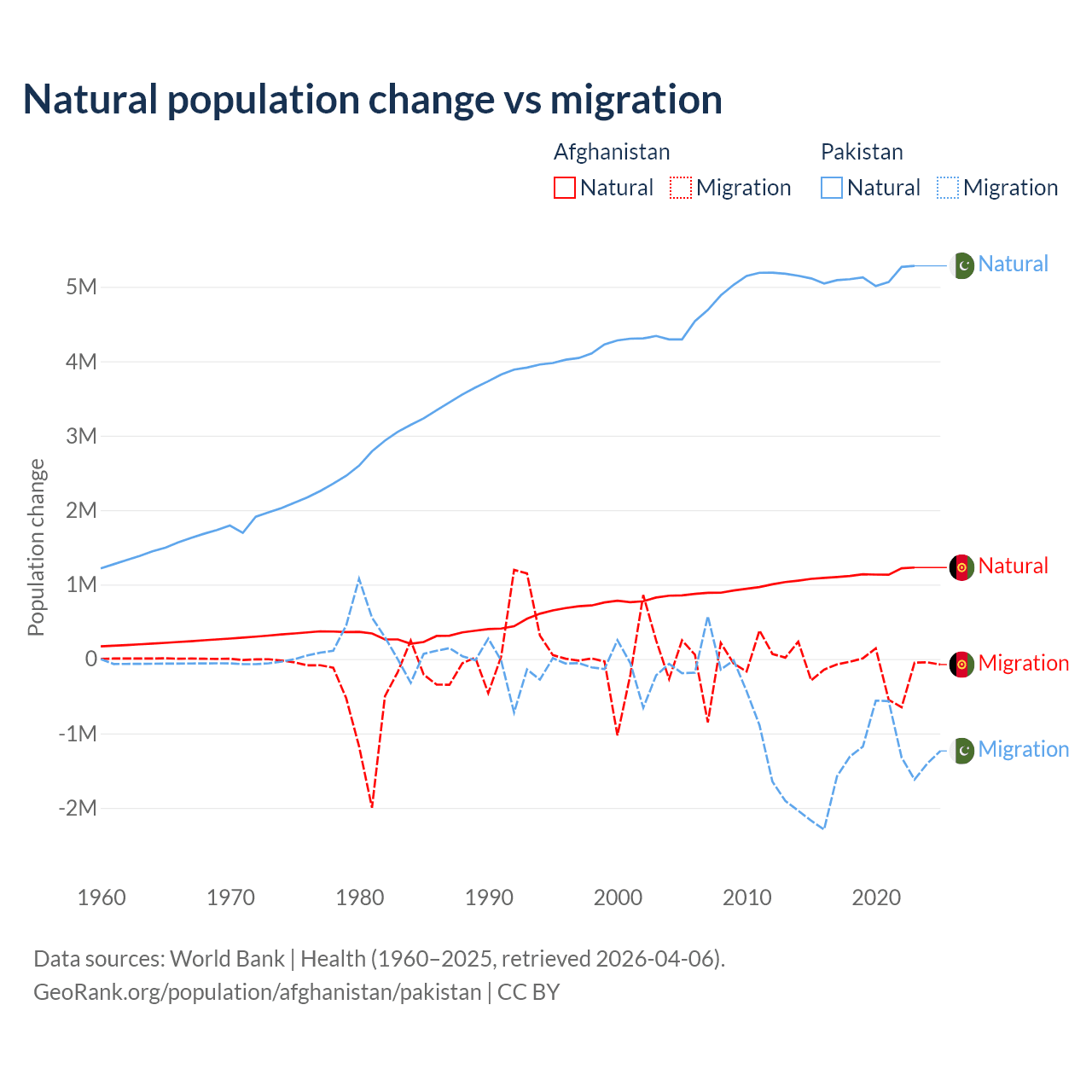 Over the last 10 years, 89% of the population change in Afghanistan is from natural causes (a gain of 11,292,049 people) and 11% is from migration (a loss of 1,396,045 people). In Pakistan 77.8% is from natural causes (a gain of 51,255,404 people) and 22.2% is from migration (a loss of 14,629,055 people).