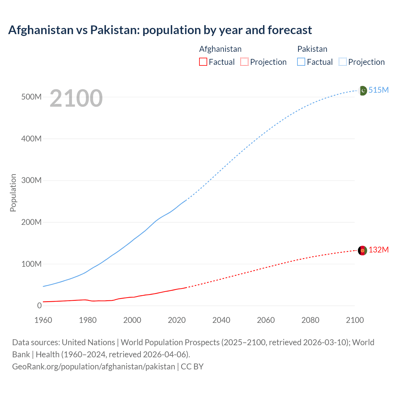 Afghanistan vs Pakistan: population by year and forecast